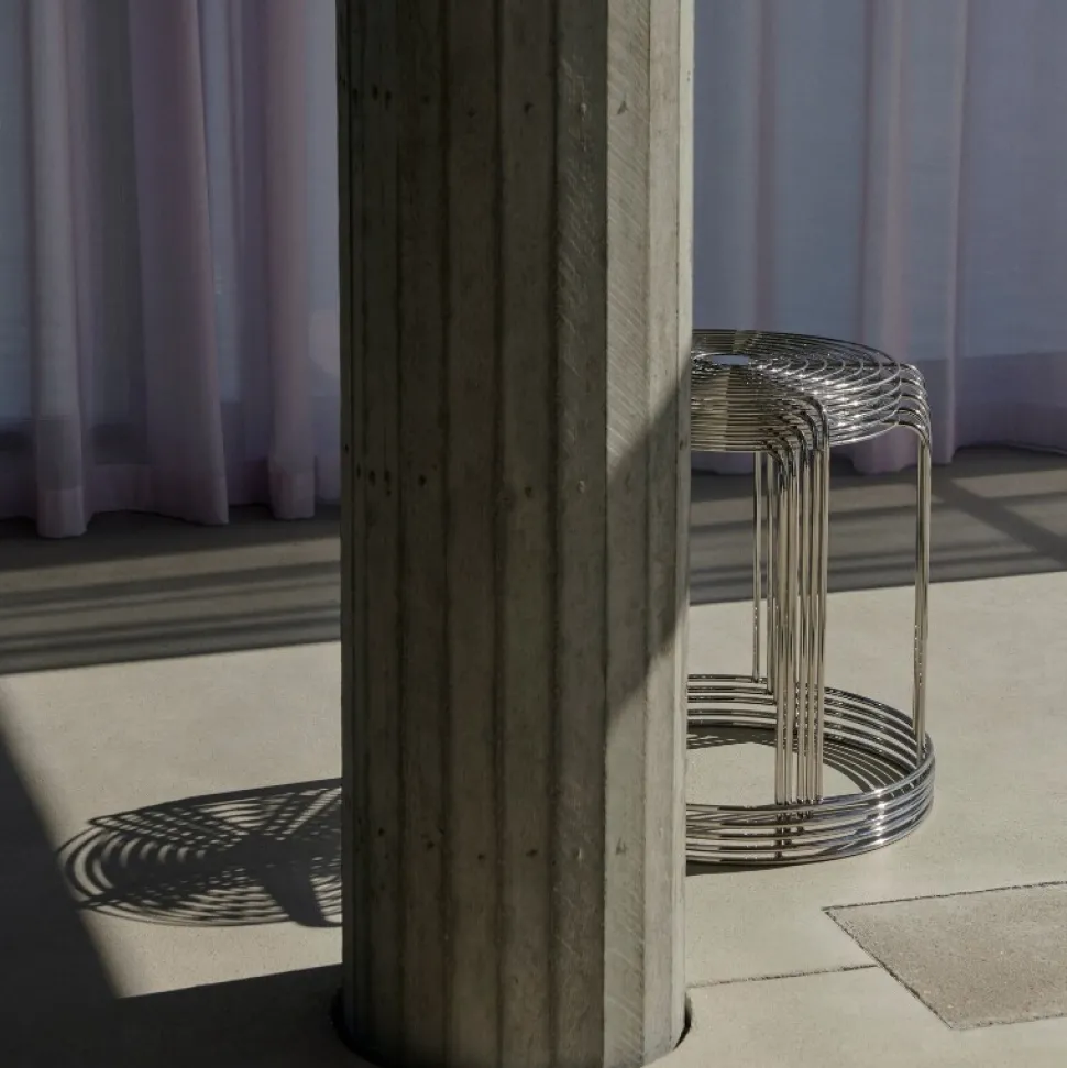 Det, der gør Wire Stool umiskendelig Verner Panton, er brugen af rustfrit ståltråd til at skabe en enkel geometrisk form med gentagne mønstre i en stabelbar skammel, der tilmed fungerer som et smukt sidebord.
