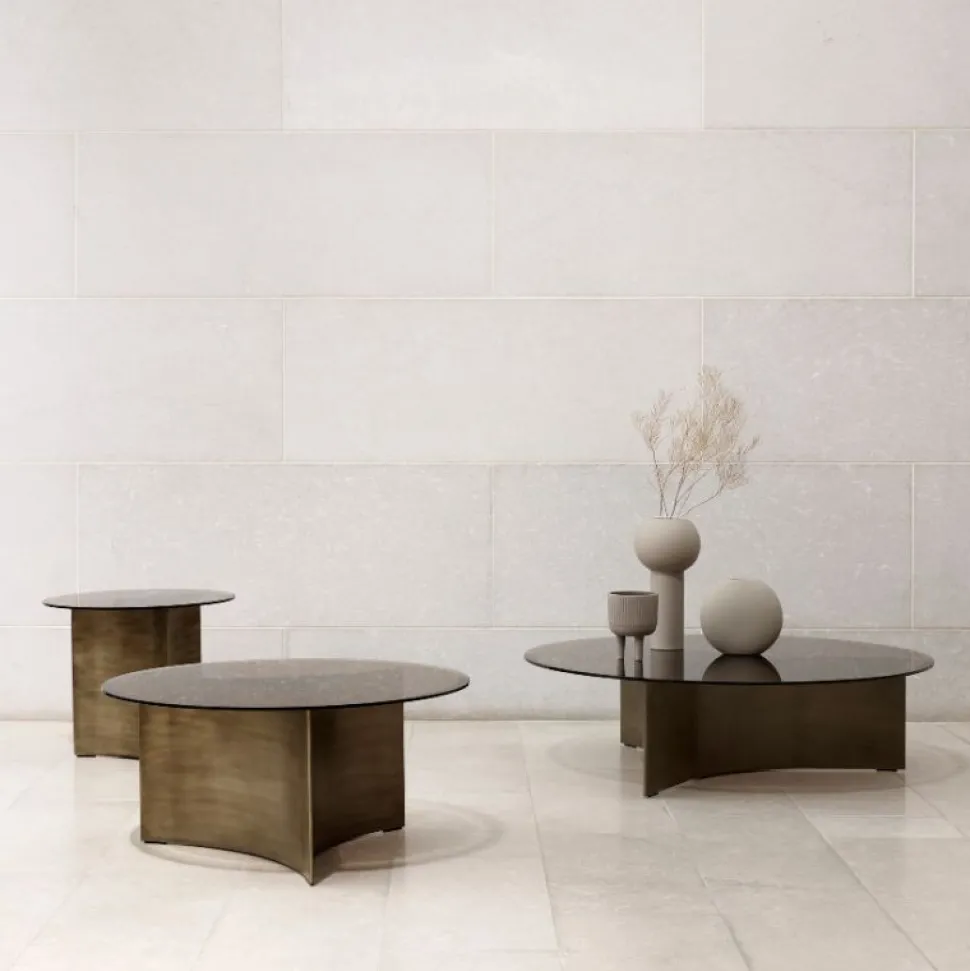 Arc er designet af Toan Nguyen og er sammensat af geometriske former, som danner et elegant og moderne sidebord. Kollektionen omfatter tre borde i forskellige højder og radier, fås i to farvekombinationer: Messingbelagt stålbund med hærdet røget glas bordplade eller sortpoleret stålbund med bordplade i sort hærdet glas.
