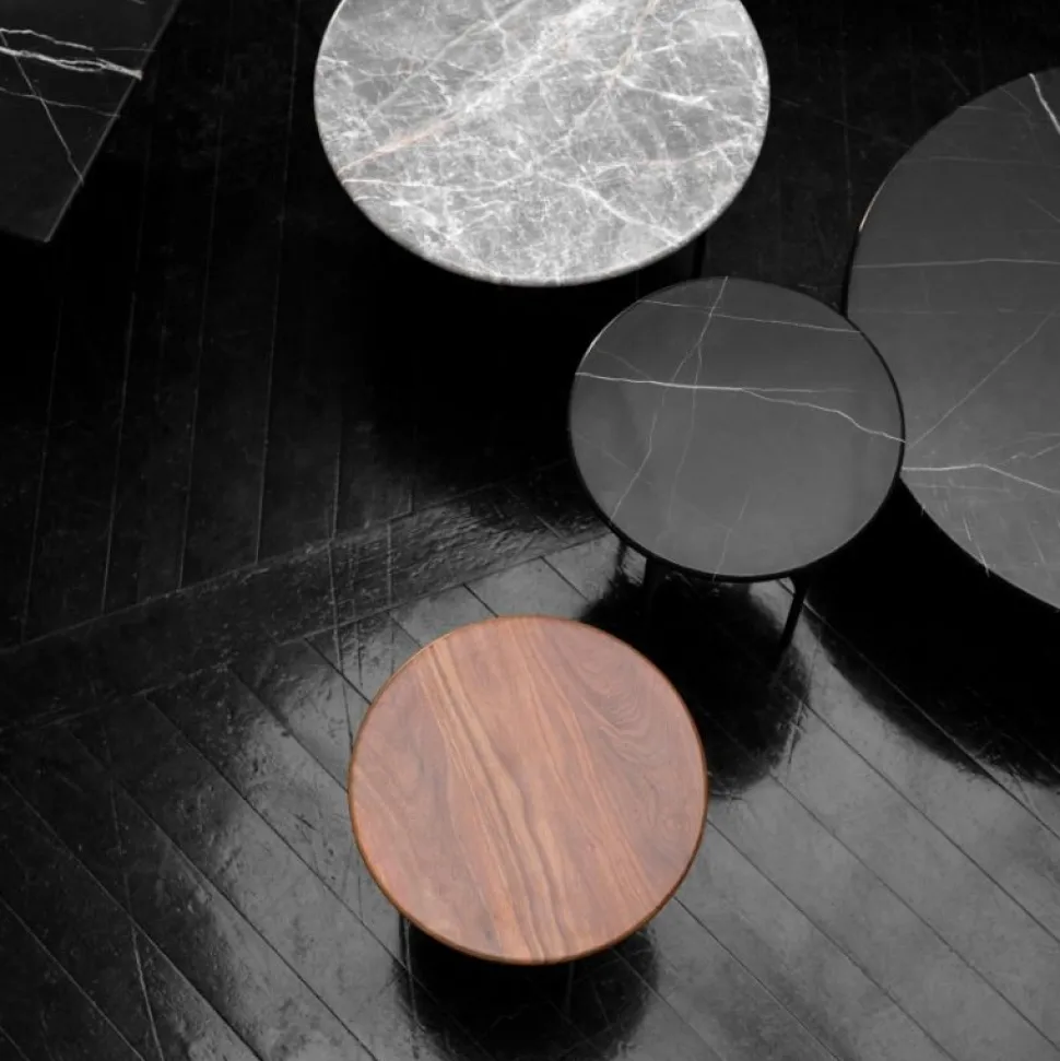 De små Floema-borde forener elegant geometriske former. Floema er lavet med bordplader i enten sort laminat, eksklusivt marmor eller massiv valnød for en førsteklasses håndfølelse. Bordet svæver på en let ramme af sort pulverlakeret stål.