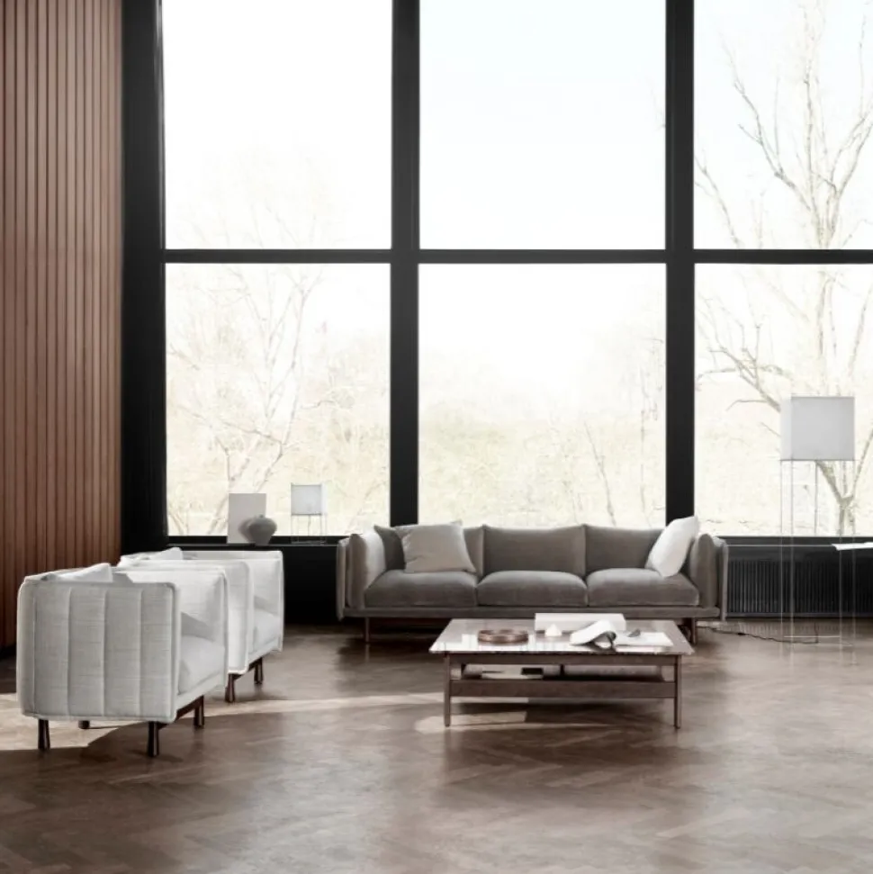 Robust og omsluttende ydre af polstrede paneler, der efterligner en drage og samtidig byder på et blødt, indbydende indre. Trærammen i sortbejdset eg og de tydelige kegleformede ben, forener design med imponerende snedkerdetaljer. Sofaen er yderligere beriget med en omhyggeligt skræddersyet æstetik samt de bløde ryg- og sidepuder, der blidt omslutter det behagelige og indbydende sæde.