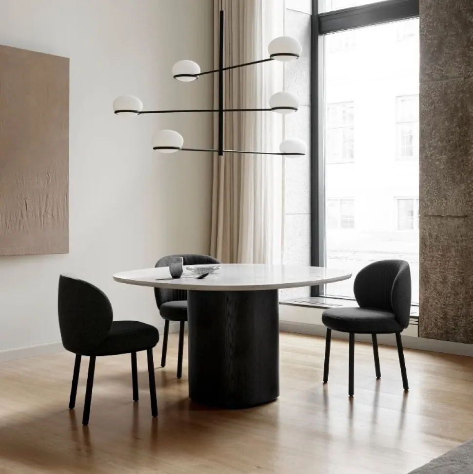 Ovata-bordet har en enkel bordplade støbt i matpoleret, grå Jura-kalksten. Bordpladens karakteristiske, beroligende og afrundede form afspejles i den robuste søjlebase, som udstråler en diskret, luksuriøs følelse.