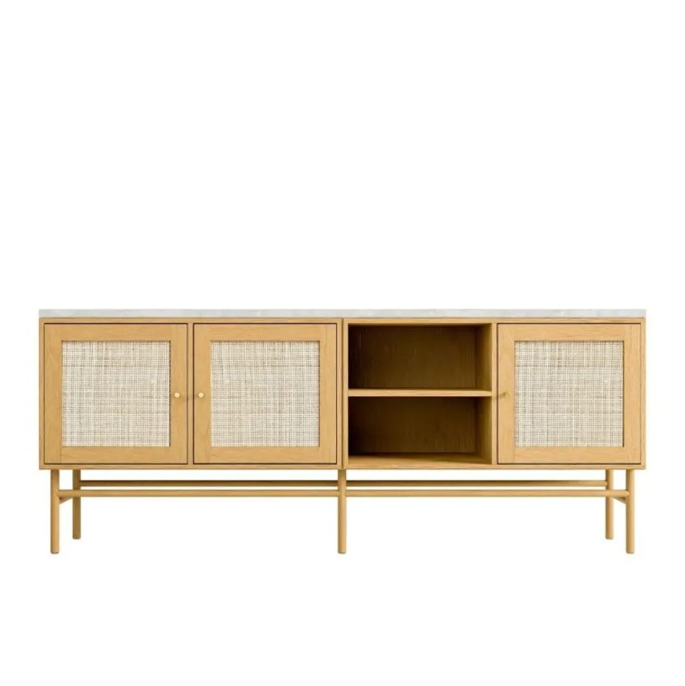 Her er TV reolen vist med Italiensk marmor top plade, som kan tilkøbes. Ledningshuller kan laves til dine specifikke behov, da hver enhed produceres ud fra ordre. Andre størrelser, variationer kan ligeledes produceres til dine behov, i kraft af ATBO reolens modulære system. Alle ATBO reoler i massivt træ har unikke “Finger-tapping” samlinger.