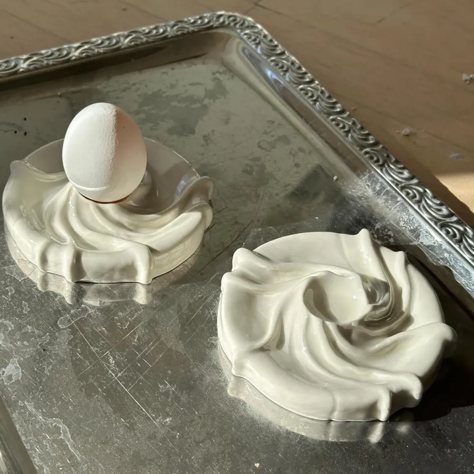 Smukt og æstetisk æggebæger, der er håndlavet i det fineste, hvide porcelænsler. Den lille kant muliggør plads til en ske, lidt salt – eller æggeskallerne, når morgenmaden nydes i ro og nærvær. Æggebægeret er inspireret af Vadehavets bølgende aftryk i sandbunden, når vandet trækkes tilbage og efterlader sine fine mønstre i det nøgne landskab. Et poetisk møde mellem natur og keramik. Designet er skabt med kærlighed til håndværk, hvorfor der kan forekomme små variationer; variationer, der gør hvert æggebæger til sit helt eget.