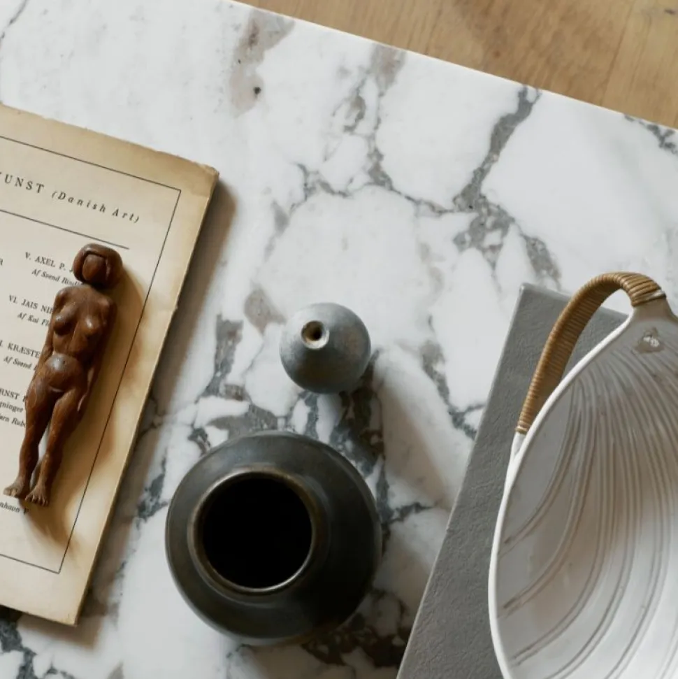 Bordet fås i naturlig eller mørkbejdset eg, valnød, eller med en eksklusiv bordplade i enten kunis breccia-sten, calacatta viola- eller grey galaxy-marmor. Kombinationen af det robuste træ og de raffinerede stenoverflader skaber et unikt visuelt spil mellem varme og kølighed, blødhed og kant.