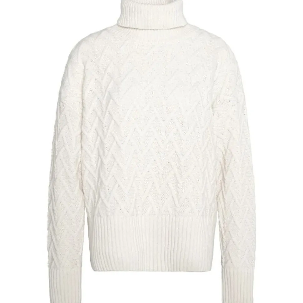 Den rene hvide farve gør strikken alsidig og nem at style med både jeans, nederdele eller uldbukser – et elegant valg til efterår, vinter og kølige forårsdage.