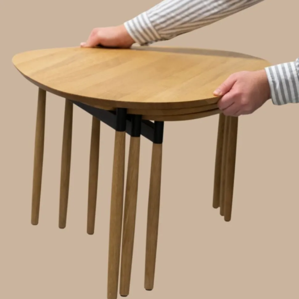 Indskudsbordene Forma har en overraskende praktisk feature. De tre indskudsborde glider ubesværet ind under hinanden og låser, så du nemt kan løfte alle tre borde på én gang ved blot at holde i det øverste bord. De muslingeformede borde kan tilsammen danne et utal af forskellige former, der giver rum til kreativitet.