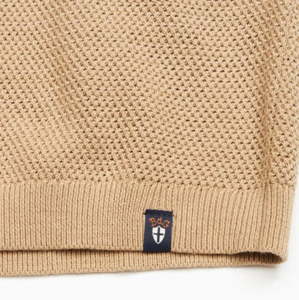 Designet kombinerer flere strikketeknikker og har en regulær pasform, hvilket giver både struktur og visuel dybde. En diskret logolabel på venstre front fuldender det gennemførte udtryk.