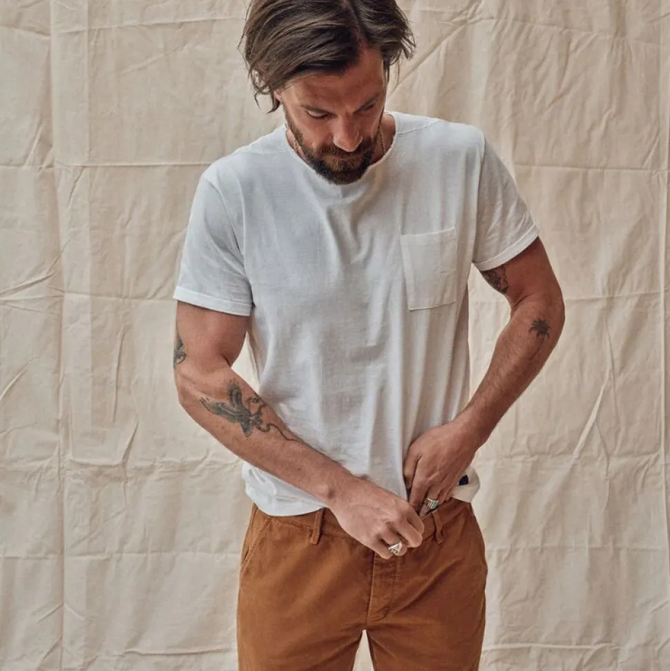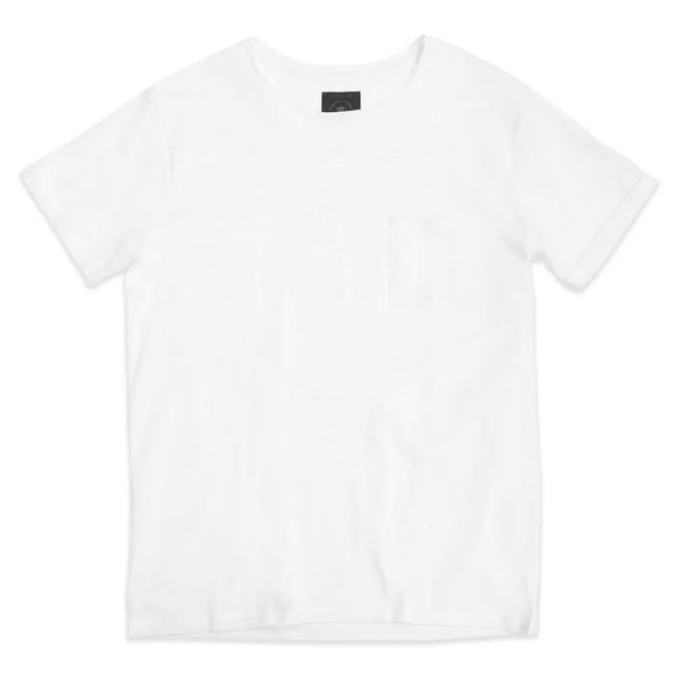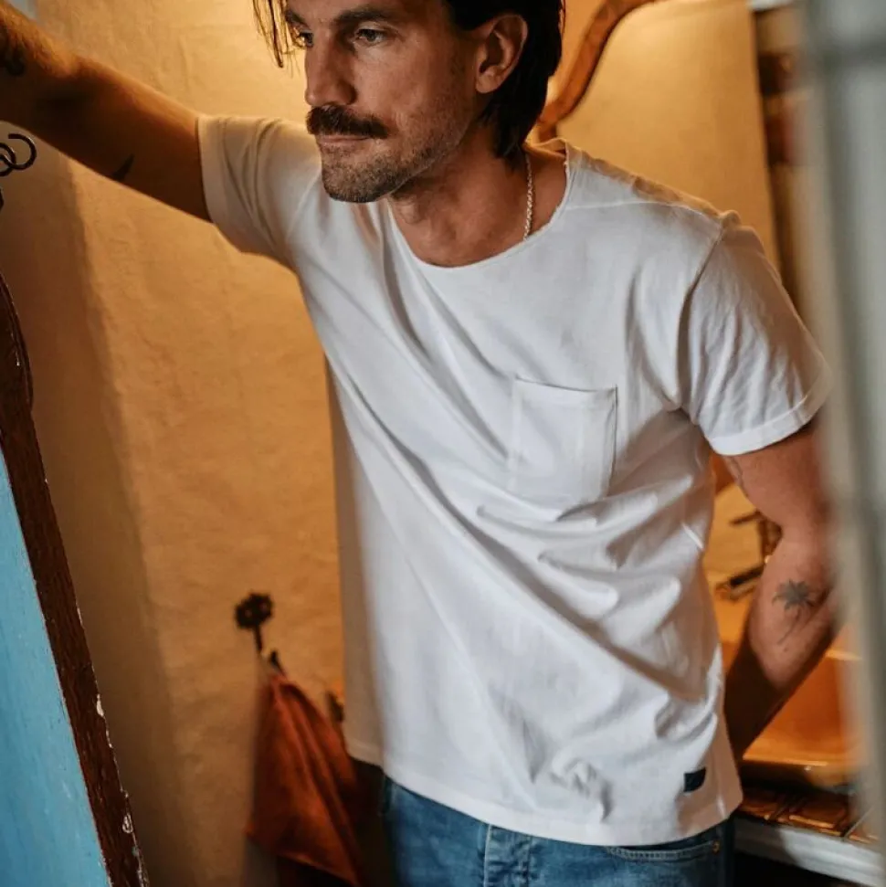 Den er fremstillet i 100% premium bomuld og har en regulær pasform, der sidder komfortabelt uden at være for løs. Et enkelt brystlommedesign kombineres med rå kanter i halsudskæringen, diskrete dekorationsstikninger i nakken og på ryggen samt en elegant opsmøg ved ærmerne – alt sammen med til at give T-shirten karakter og maskulint udtryk uden at gå på kompromis med enkelheden.