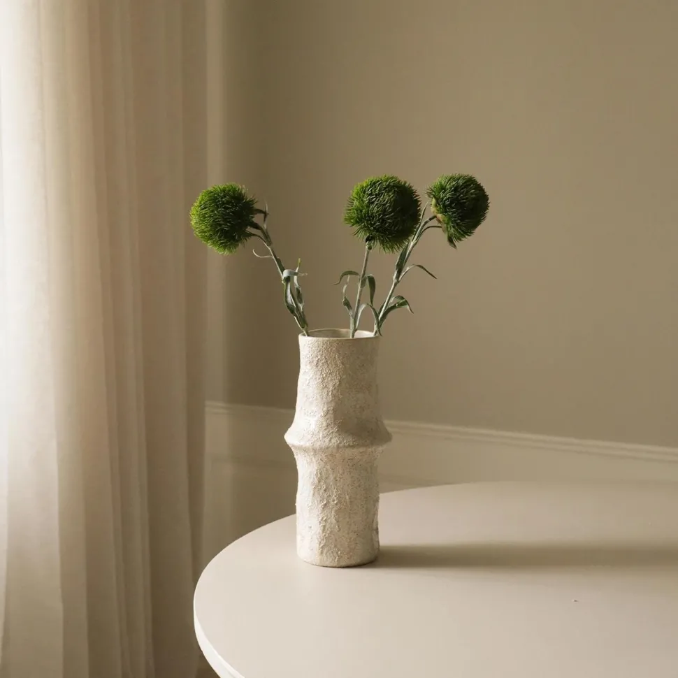 Iøjnefaldende blomst, der tilføjer et unikt, levende udtryk til blomsterarrangementer. Den tætte, boldformede blomsterkrone er dækket af fine, grønne tråde, der skaber en spændende tekstur og en næsten grafisk effekt – alt sammen i en dyb, mørkegrøn nuance, der bringer ro og dybde til ethvert udtryk. Den slanke stilk og de smalle blade understøtter det dristige formsprog og giver blomsten et moderne, skulpturelt præg. Med sin højde fungerer blomsten både som kontrast og som en sammenbindende grøn tråd i buketter og dekorationer. Naturens svar på design – vild, stilren og fuld af karakter.