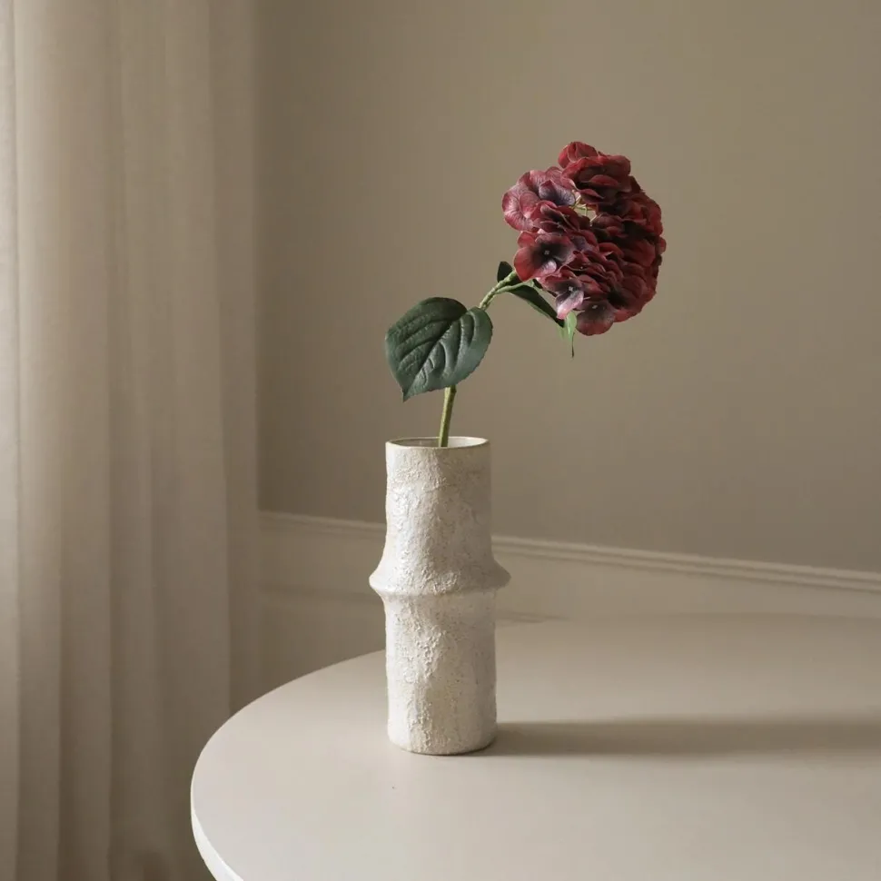 Yndefuld hortensia med dybe, flerdimensionelle kronblade, der skaber en fyldig og levende blomst. De lagdelte blomsterhoveder kontrasteres smukt af brede, grønne blade med tydelige årer, hvilket giver et autentisk og naturligt udtryk. Blomsten er ideel til både buketter, dekorationer eller som enkeltstående arrangementer, hvor den tilfører farve, fylde og struktur.
