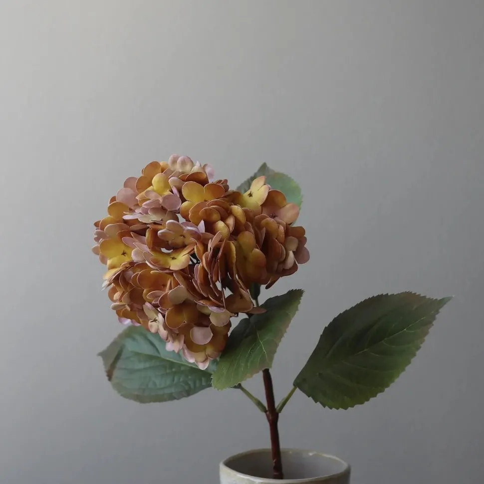 Yndefuld Hortensia-blomst, der med sin frodige, voluminøse blomstring er indbegrebet af elegance og ynde. Hvert delikat kronblad danner et smukt blomsterhoved, som suppleres med grønne blad, hvormed dets naturlige skønhed fremhæves. Bladene er skabt med autentiske årer og en levende farvenuance, der bidrager til et livagtigt udseende. Blomsten er designet til at være alsidig, hvorfor stilken kan bøjes og formes efter eget ønske. Lad kreativiteten blomstre!