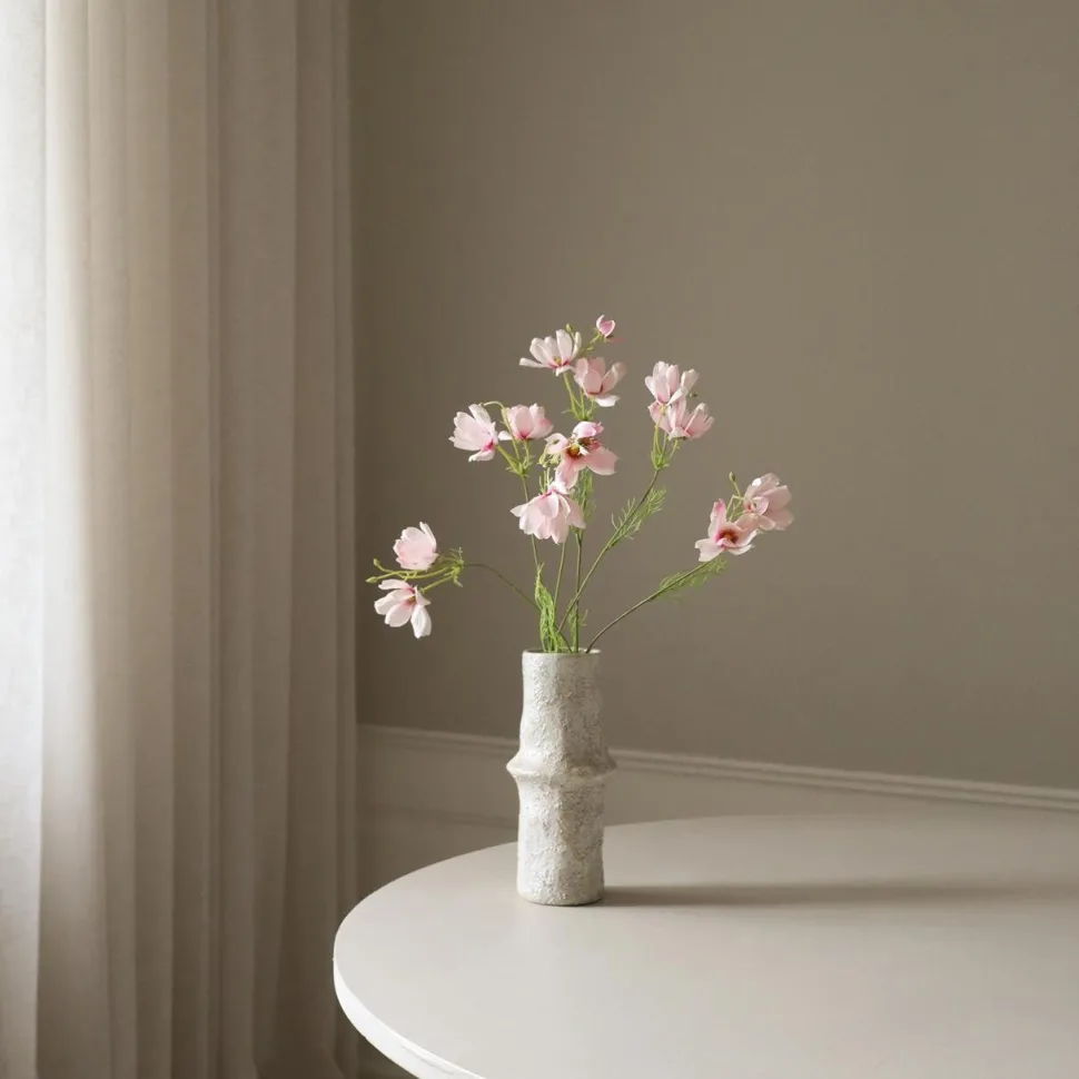 Elegant og let som forårsluft. Blomsten har delikate kronblade, der gradvist skifter fra blød hvid ved basen til en sart rosa nuance langs kanterne. Midtpunktet stråler i en klar gul tone med fine, teksturerede filamenter, som tilfører blomsten dybde og en naturlig, livlig form. Blomsterne hviler på slanke, let buede grønne stilke med fine, fjerlignende blade, der vokser ud fra basen. Qua sin højde tilfører stilken ynde og bevægelse til ethvert arrangement. En blomst med blid styrke – luftig, lys og fuld af poetisk enkelhed.