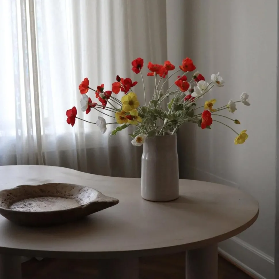 Naturtro valmueblomst i den fineste farvenuance. Blomsten harmonerer smukt, når den kombineres til en enkelt buket, idet der herved skabes et iøjnefaldende fokuspunkt, der efterlader et varigt indtryk. Blomsterhovedet er lavet af et stofmateriale, mens bladene er dækket med trichomer, for at genskabe udseendet af en naturlig valmue. Blomsten er designet til at være alsidig, hvorfor stilken kan bøjes og formes efter eget ønske. Lad kreativiteten blomstre!