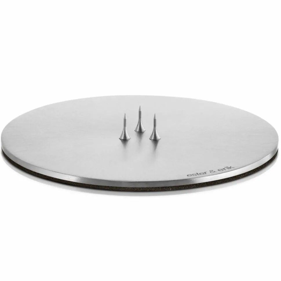Rund platte, som er fremstillet i et enkelt og stilfuldt design, der står flot til alle de håndlavede lys fra Ester & Erik. Platten benyttes særligt i kombination med kegle- og bloklys. Lyset fastholdes på platten af tre stifte i bunden, hvorved alle lys kan stå stabilt. Desuden er der tilført skum på bagsiden af platten for herved at skåne underlaget. Som overfladebehandling er der anvendt PVD, hvilket er en ny miljøvenlig måde at coate metaller på, som samtidig giver en suveræn kvalitet og finish.