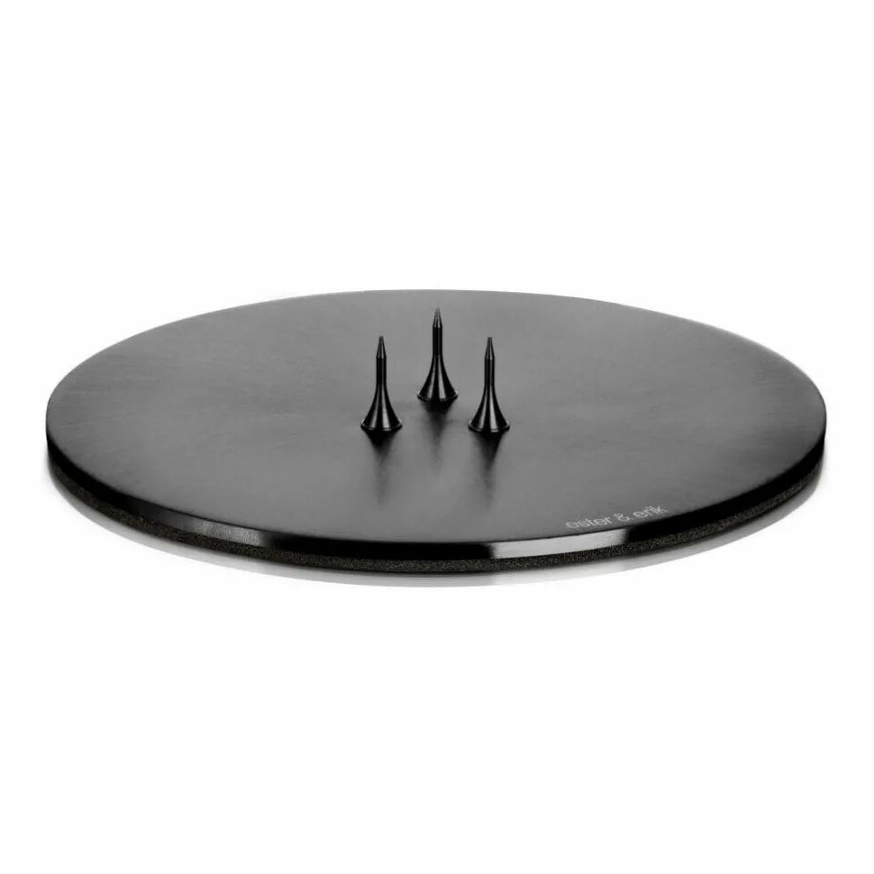 Lille, rund og klassisk platte i det fineste, stilfulde design. Platten er ideel til de håndlavede lys fra Ester & Erik – i særdeleshed til kegle- og bloklys. Lyset fastholdes på platten af tre stifte i bunden, hvorved alle lys kan stå stabilt. Desuden er der tilført skum på bagsiden af platten for herved at skåne underlaget. Som overfladebehandling er der anvendt PVD, hvilket er en ny miljøvenlig måde at coate metaller på, som samtidig giver en suveræn kvalitet og finish.