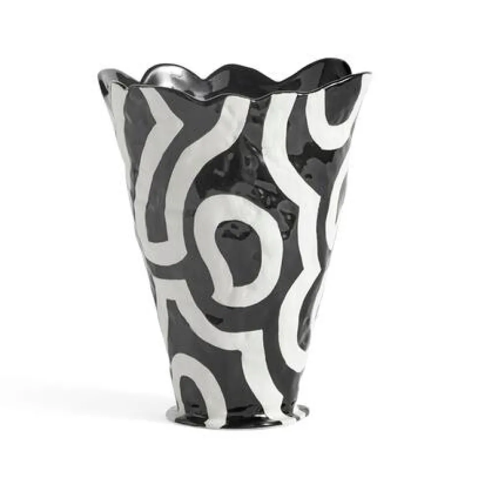 Unik vase, der har et bevidst ujævnt og uregelmæssigt design. Vasens organiske, abstrakte æstetik oversættes til et funktionelt objekt med en unik, håndmalet overflade. De monokrome farver skaber et grafisk, skulpturelt kunstværk, der kan benyttes til at fremvise blomster eller blot som et dekorativt element.