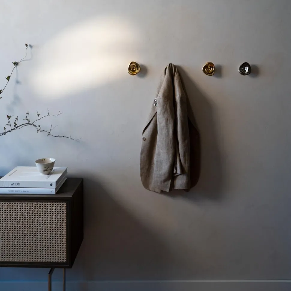 Elegant og æstetisk knage, der på fineste vis dekorerer hjemmets vægge. Knagen er inspireret af vandoverfladens bølgende bevægelser, hvilket afspejles i den organiske og ujævne overflade. Kontrasten mellem det hårde materiale og bløde formsprog tilføjer et unikt touch, der både er dekorativt og funktionelt. Knagen er håndlavet ved sandstøbning, hvorfor der kan forekomme variationer i overfladen – herunder små sorte pletter og sandkorn.