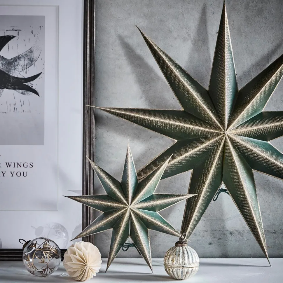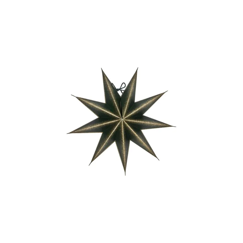 Tilføj et strejf af magi til julepynten med denne elegante, håndlavede stjerne i mørkegrønt papir. Den ni-takkede form og det fine champagneglimmer fanger lyset på fortryllende vis og skaber et eksklusivt og stemningsfuldt udtryk. Stjernen kan kombineres med en lyskilde for en varm og betagende glød eller hænges alene som et stilfuldt blikfang. Dens tidløse design gør den velegnet både som enkeltstående dekoration og i kombination med flere stjerner. Et moderne og raffineret element, der spreder stjernestøv, varme og juleglæde i hjemmet.