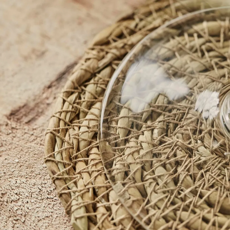 Fine bordskånere, der er håndvævet af naturligt søgræs. Bordskånerne er den ideelle blanding af funktionalitet og stil, idet de både er praktiske og dekorative. Bordskånerne er blide og holdbare, hvorfor overflader beskyttes. Hvert sæt indeholder seks bordskånere og en matchende opbevaringskurv. Den naturlige farvenuance er velegnet til enhver indretning og skaber en indbydende atmosfære.