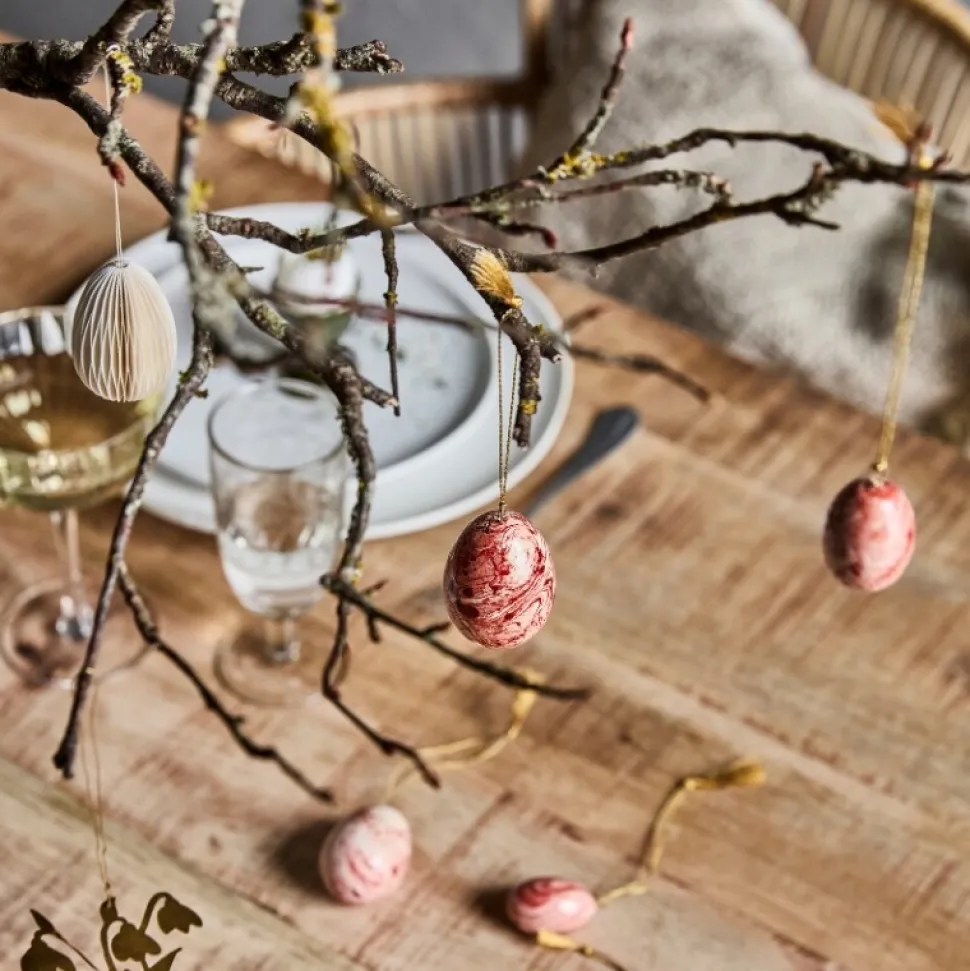 Elegante påskeæg, håndmalet med marmor effekt. Med deres smukke rødlige farve vil de helt sikkert tilføre lidt ekstra hygge og elegance til dit hjem i påsken. De er perfekte til at hænge på en gren i en vase, placere dem i en skål som en dekorativ detalje på bordet eller bare sprede dem rundt i hjemmet for at skabe en hyggelig påskestemning.