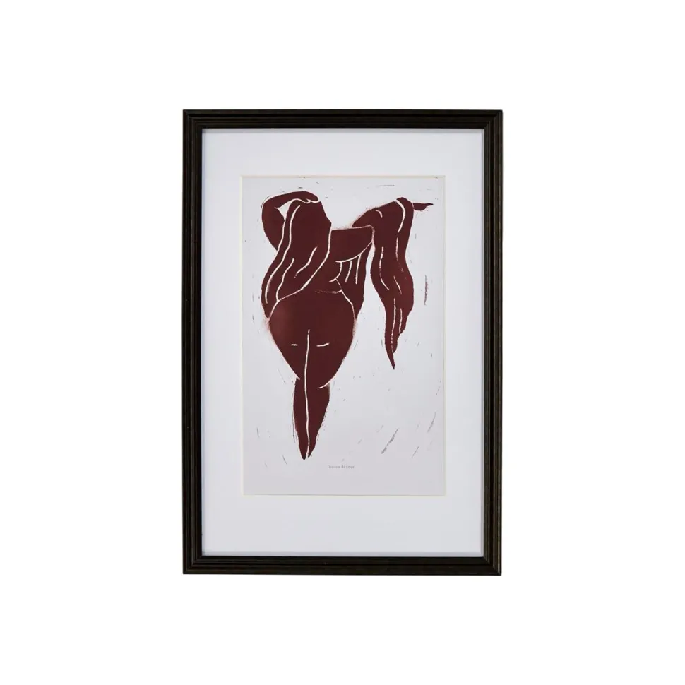 Fængslende vægkunst, der tilføjer et levende og kunstnerisk præg til boligindretningen. Den slående afbildning af en kvinde i mørkerød bringer dybde, varme og karakter til indretningen. Indrammet i sort aluminium og fremhævet med hvid passepartout balancerer værket dramatik og raffinement. Værket er ideel at inkorporere i en gallerivæg qua tilførslen af farve, men det står ligeledes smukt i al sin enkelthed.