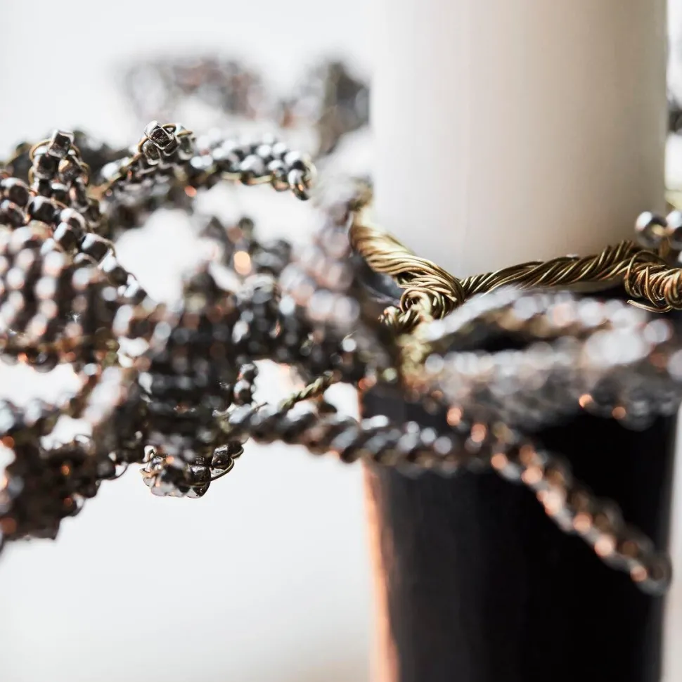 Yndefulde lysmanchetter, der muliggør udsmykning af lysestager. Lysmanchetterne er håndlavet af perler i sort og sølv. Trods vintage-designet er de velegnet i enhver boligindretning. Med disse lysmanchetter forvandles hverdagsstager hurtigt til julepynt i vindueskarmen eller på spisebordet.