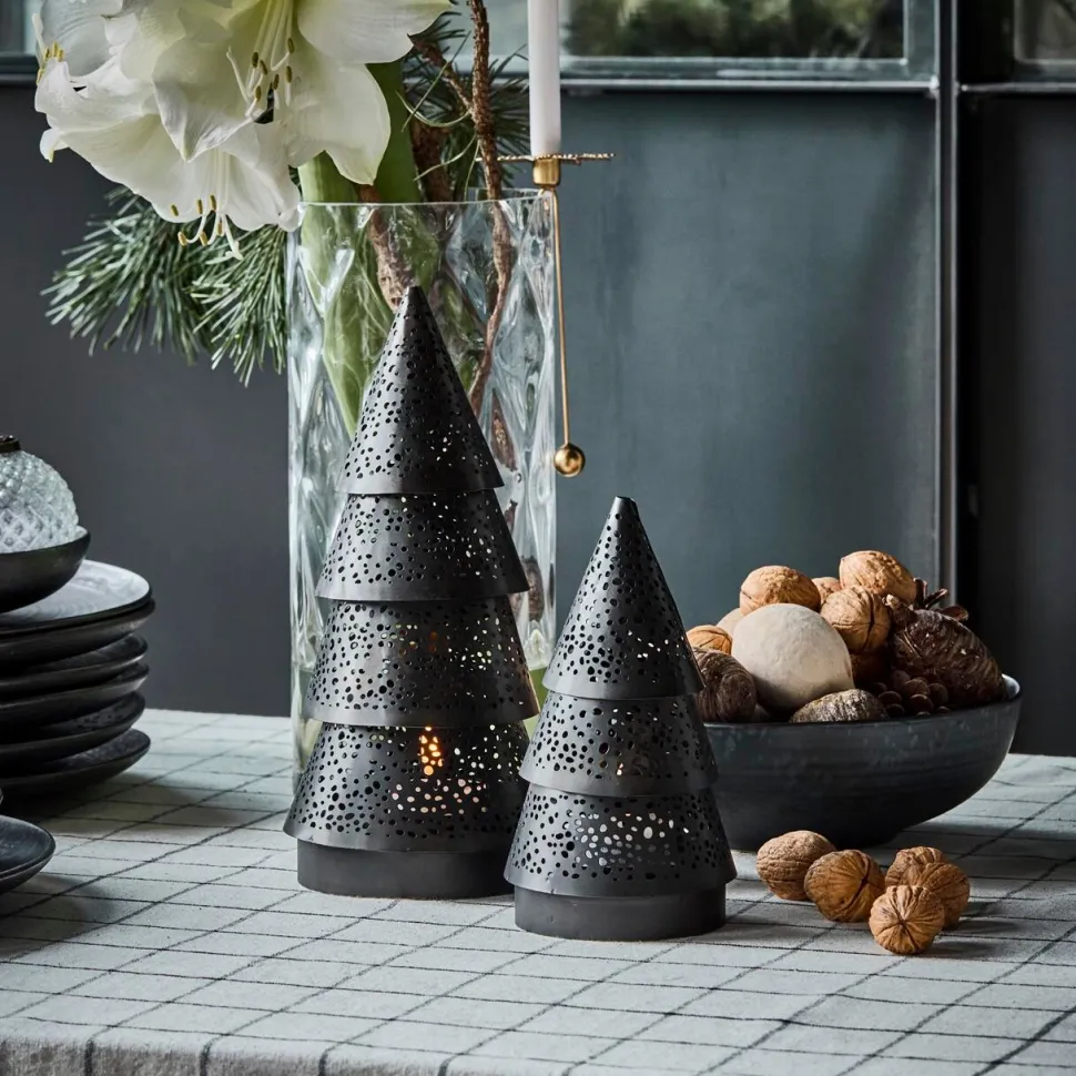 Håndlavede juletræer, der skaber en varm og stemningsfuld jul. Den fine farvenuance og det yndige, perforerede mønster lader lyset skinne igennem og spreder et indbydende og hyggeligt skær i rummet. Træernes aftagelige top giver mulighed for at placere lys indeni, hvilket fremhæver det dekorative mønster og skaber en magisk atmosfære. Et elegant og tidløst sæt, der er ideelt på middagsbordet, i vindueskarmen eller på reolen – og som bringer varme, glød og julestemning ind i hjemmet.
