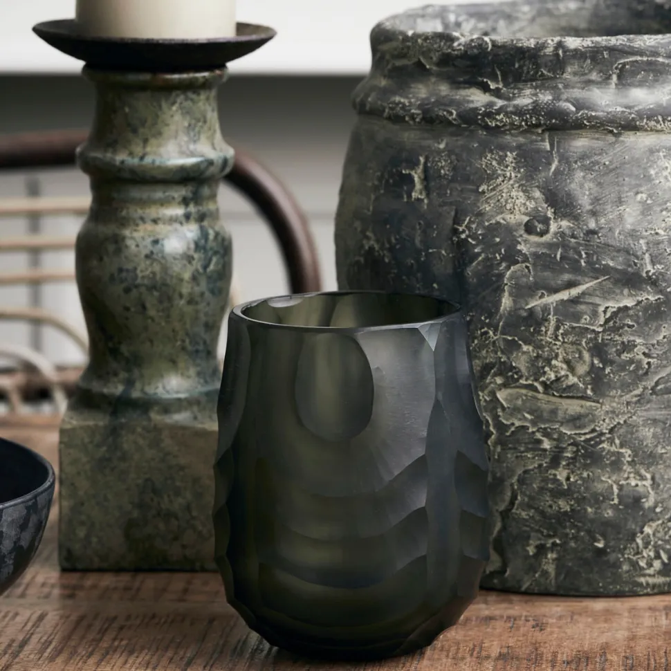 Enkel og farvestrålende fyrfadsholder, som tilføjer en beroligende effekt til hjemmet. Fyrfadsstagen er fremstillet af genanvendt, mørkegrønt glas. Glasset har fået en håndlavet finish, der tilføjer struktur til overfladen. Stagen er ideel at anvende når aftenerne bliver mørkere, eller såfremt man ønsker at skabe en intim og hyggelig atmosfære. Eftersom fyrfadsholderen er håndlavet forekommer der variation i farve og finish.