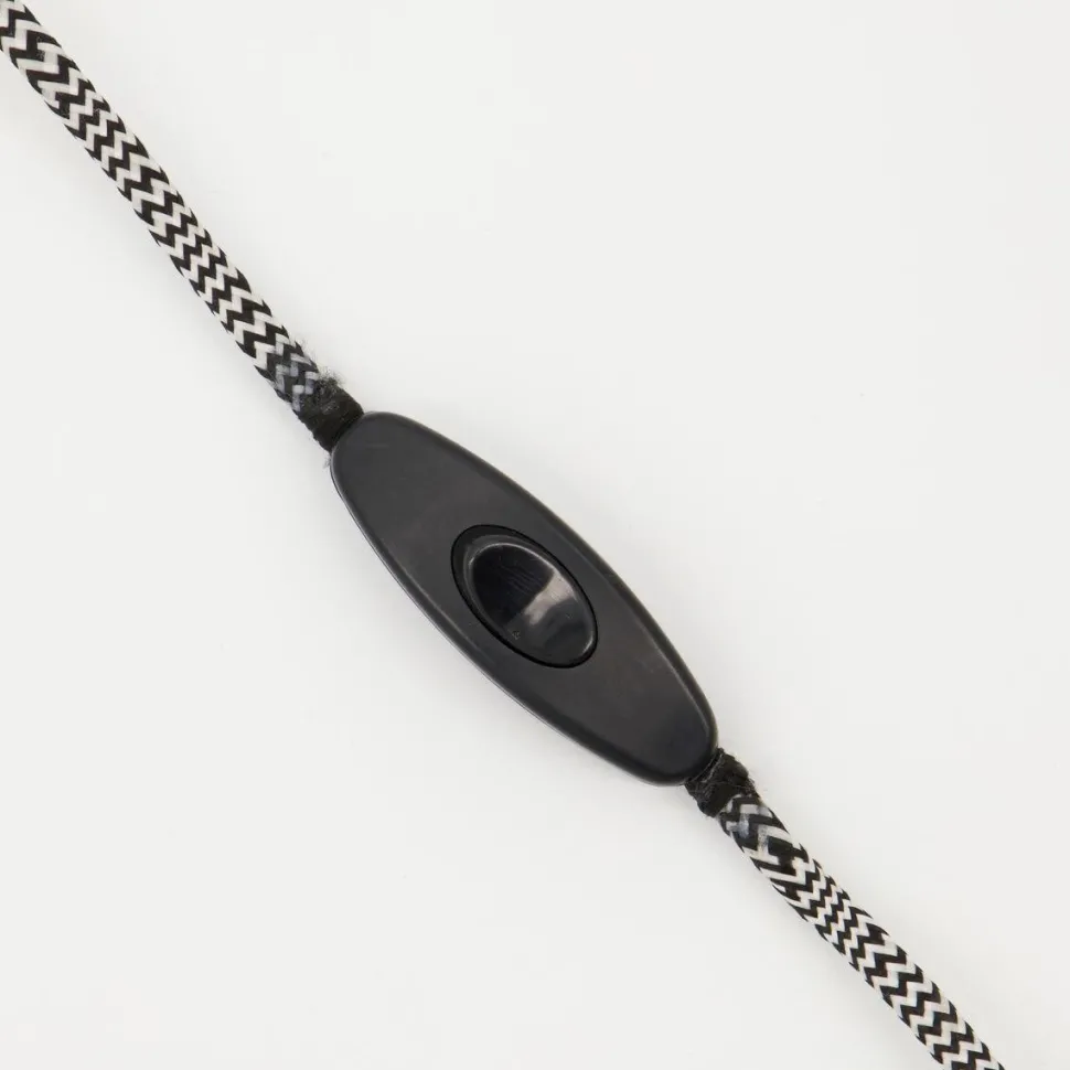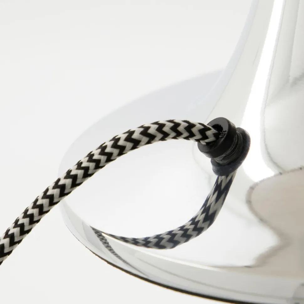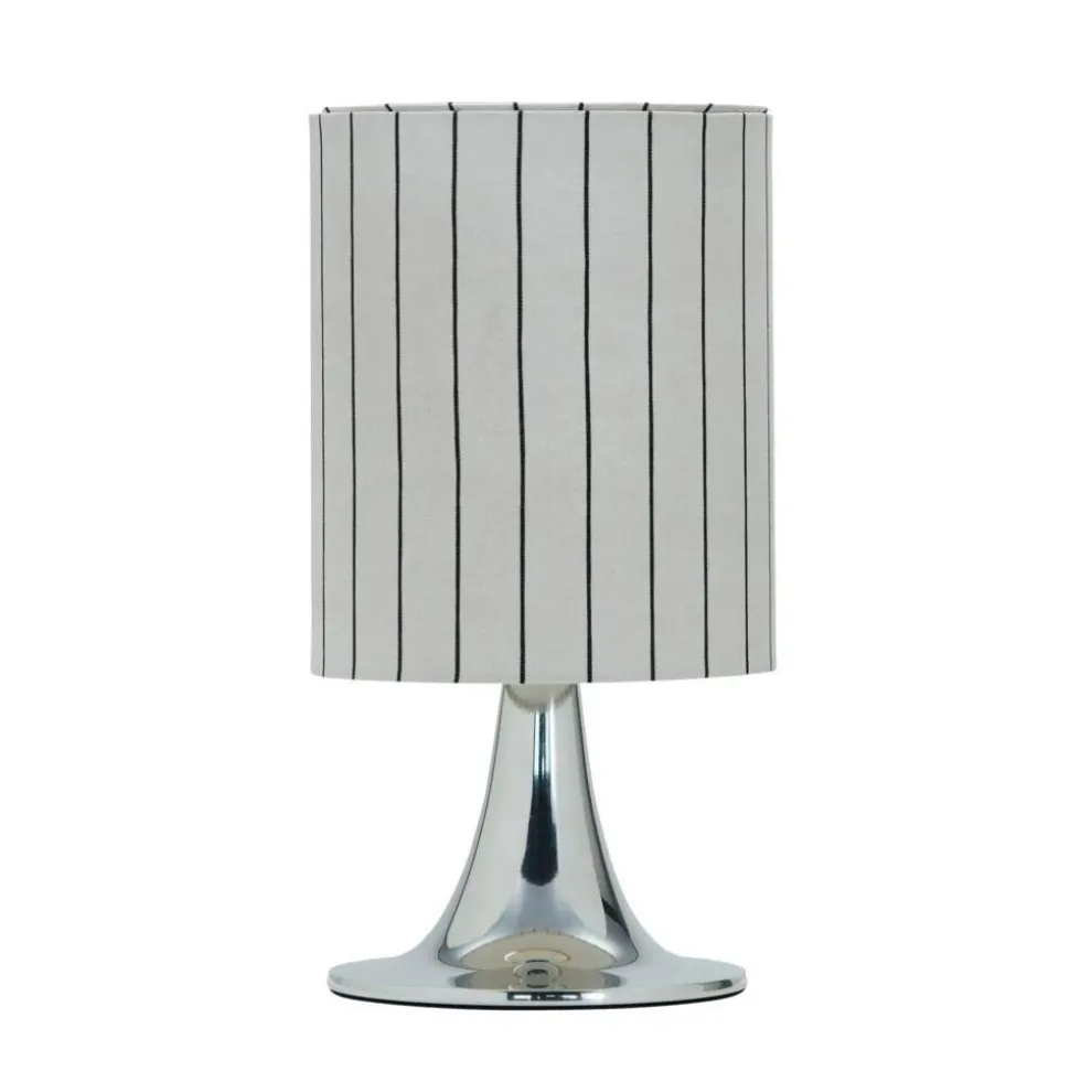 Finurlig bordlampe, der tilfører en dekorativ og funktionel belysning til hjemmet. Lampen er designet med en slank aluminiumsfod og udført i en tulipanform, der kombineres med en hørfarvet lampeskærm, hvorpå der er vertikale sorte striber. Bordlampen er et must-have, idet den tilføjer personlighed og kant til boligindretningen.