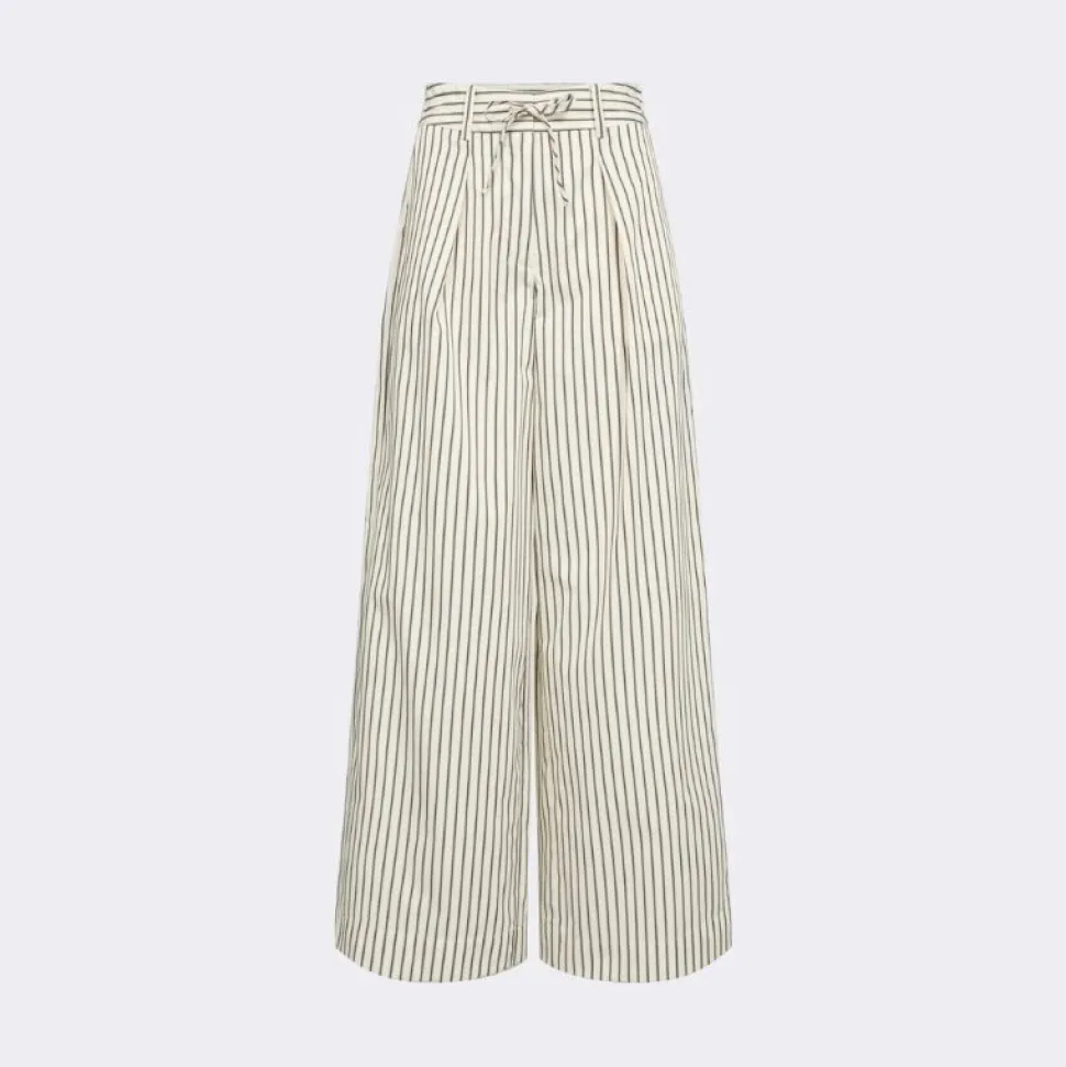 Bukserne har et elegant nålestribet mønster, læg foran og et bredbenet snit, som giver en flatterende og luftig silhuet. Den elastiske talje med justerbar snøre sikrer en god pasform og gør dem velegnede til både hverdagsbrug og mere formelle sammenhænge.