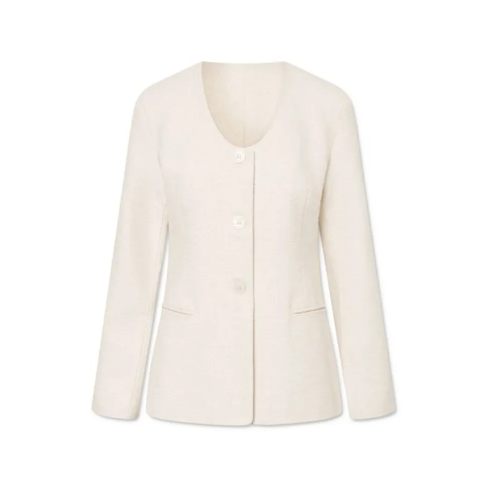 Denne smukke jakke kombinerer klassiske snit med feminine detaljer og er skabt i en let og åndbar blanding af 55% hør og 45% bomuld. Designet er karakteriseret ved en rund, dyb halsudskæring og en tætsiddende talje, som fremhæver figuren på elegant vis.