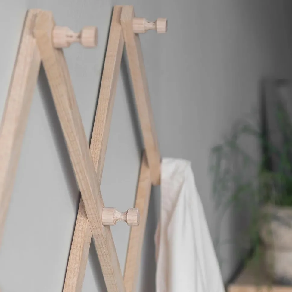 Enkel og tidløs knagerække, der er skabt til både at være et æstetisk og praktisk element i indretningen. Den traditionelle sakseknage har fået en moderne opdatering og er fremstillet i egetræ. Den massive egetræskonstruktion sikrer, at hver knagerække er unik med variationer i farve, knuder og årer.