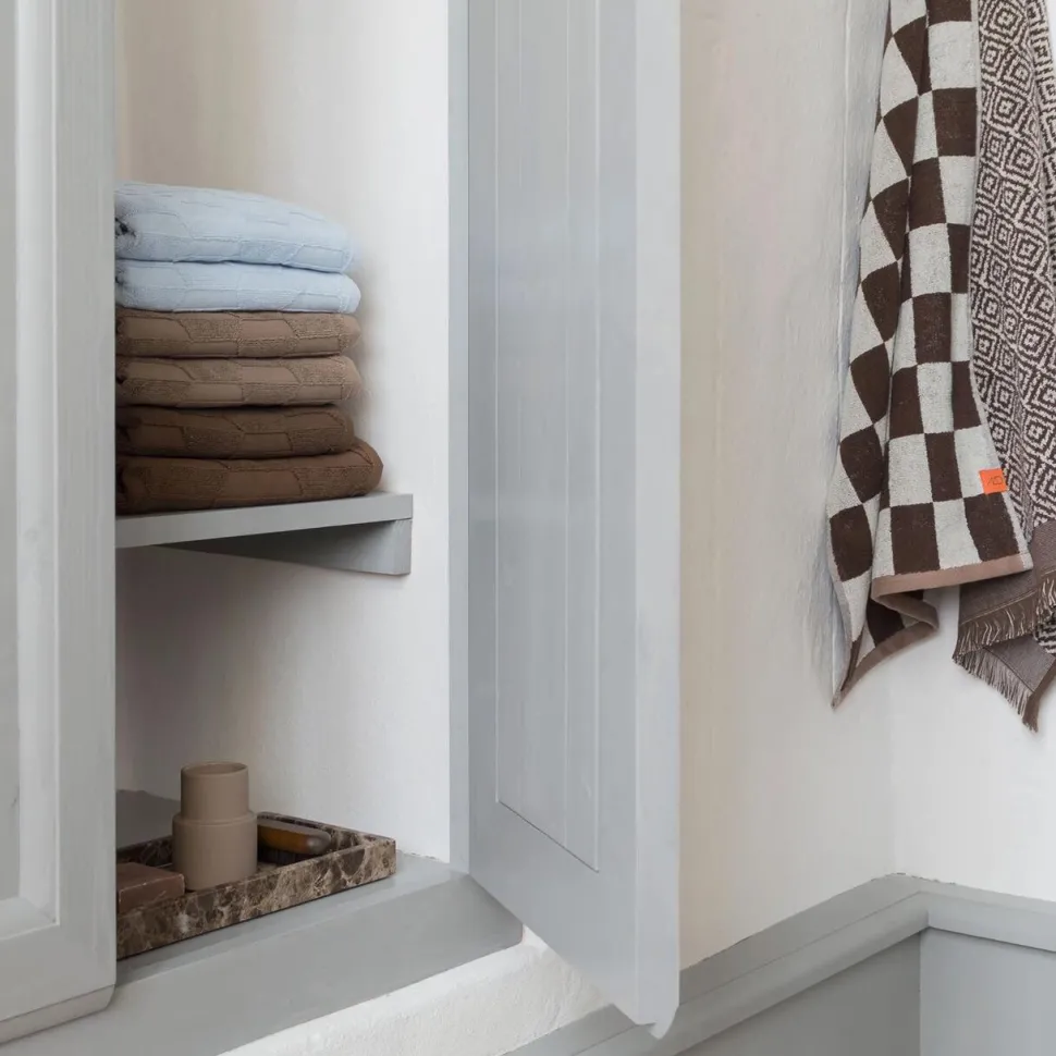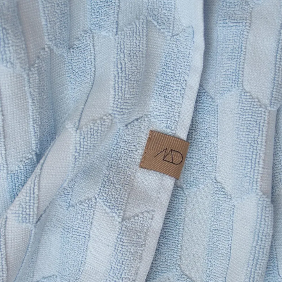 Farvefint håndklæde, der tilføjer et strejf af elegance og funktionalitet til badeværelset. Håndklædet er udført med en høj-lav vævningsteknik, der skaber et tredimensionelt, grafisk mønster. Farvenuancerne – lyse såvel som mørke – opdeler den sekskantede form, hvormed der tilføjes visuel dybde og en karakteristisk tekstur. Håndklædet er fremstillet af 100% bomuld, hvorfor både blødhed og holdbarhed garanteres.