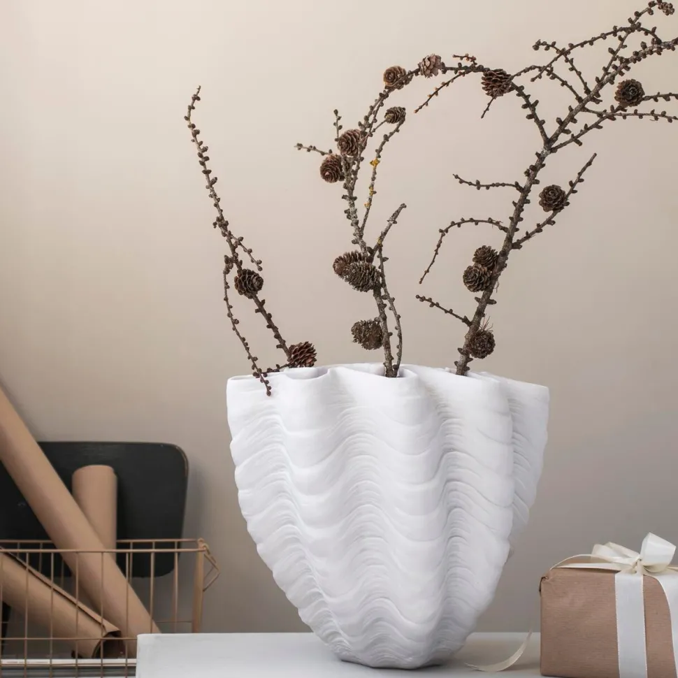 Voluminøs og dekorativ vase, der tilfører et strejf af havets ro og elegance til boligindretningen. Vasen er et iøjnefaldende statement piece, idet den nøje efterligner formen af en naturtro musling qua sin organiske form – i al sin enkelthed er den et kunstværk. Særligt for vasen er, at den – som følge af sin naturligt formet åbning – tilbyder god støtte til blomsterne, idet den forhindrer udfald til siderne; det er således nemt og effektivt at arrangere større blomsterarrangementer heri.