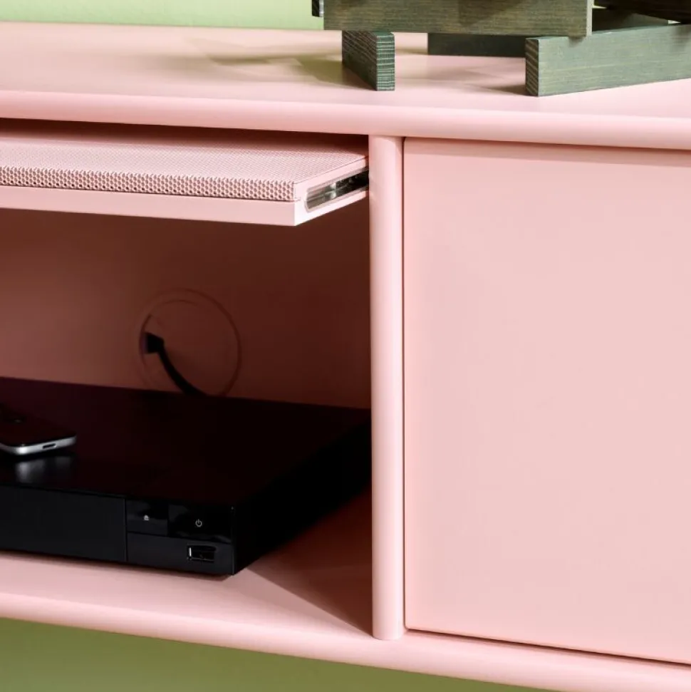 OCTAVE V er et sofistikeret og elegant tv-bord med skuffer og døre designet til diskret at skjule elektronik. Møblet har tre rum – to skuffer og en midtersektion med en perforeret klaplåge, der gør det nemt at betjene enheder og samtidig bevare de rene linjer.