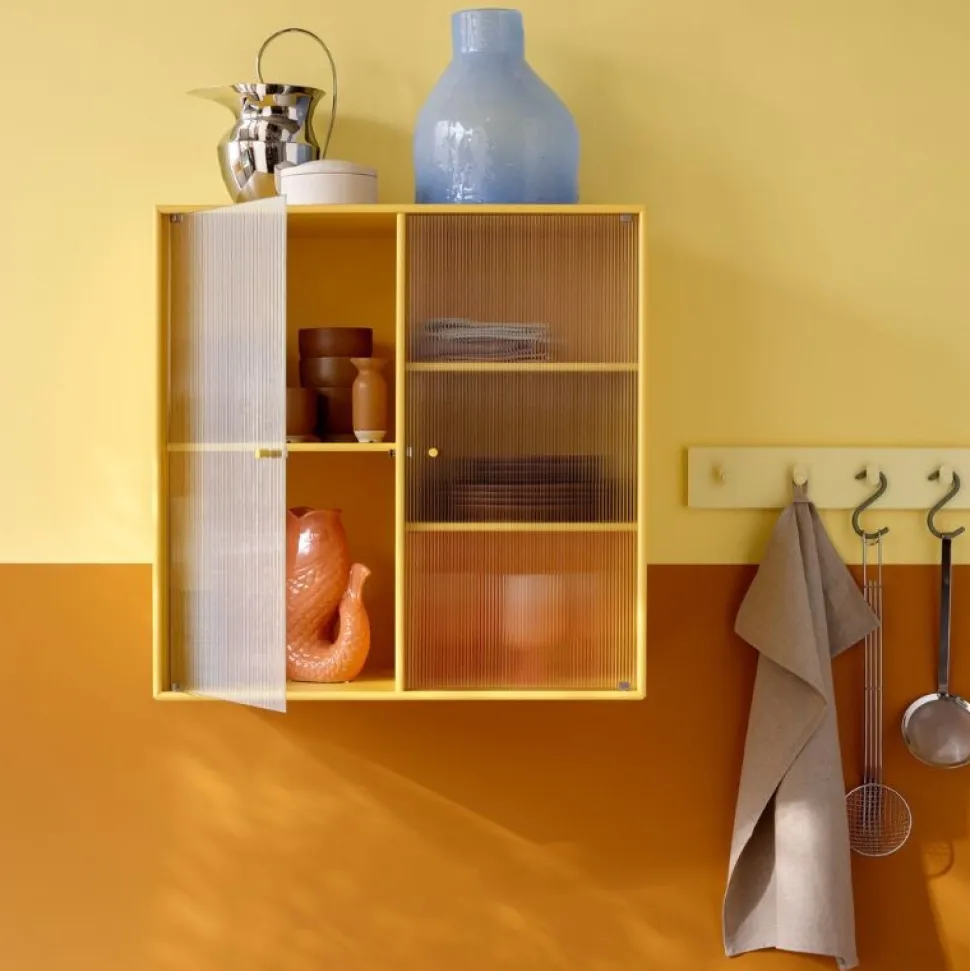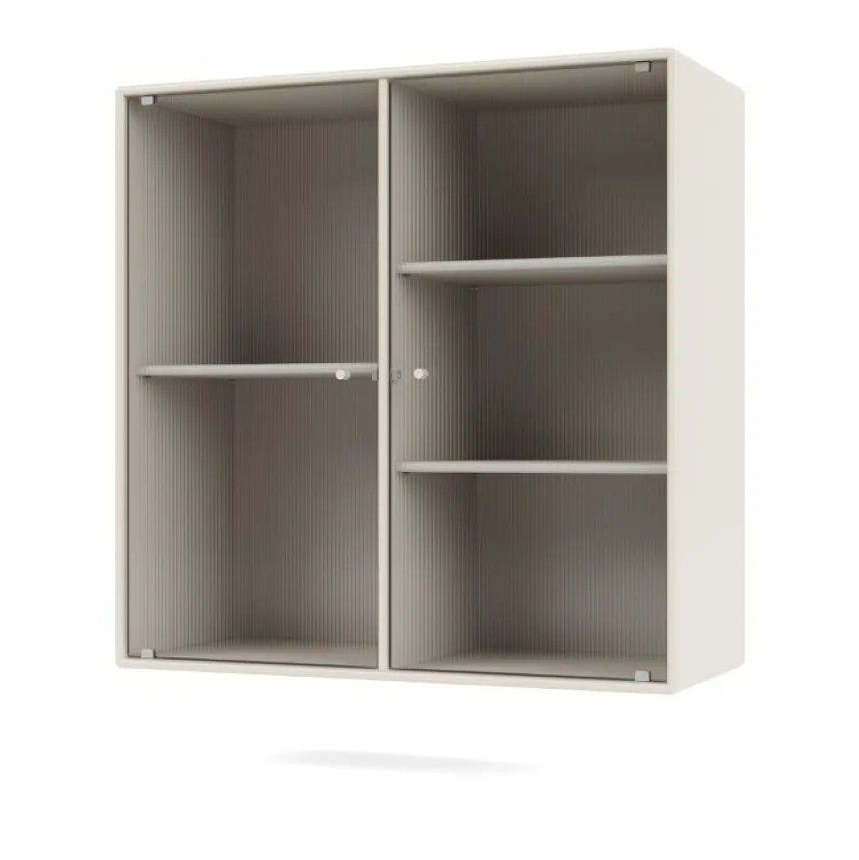 Det smukke Ripple 2 fra Montana er et vitrineskab med 2 låger i riflet glas. Skabet fås med ophængsbeslag, sokkel og ben. Skabet kan elegant indgå i ethvert køkken, eller som et udstillingsmøbel i stuen eller spisestuen.