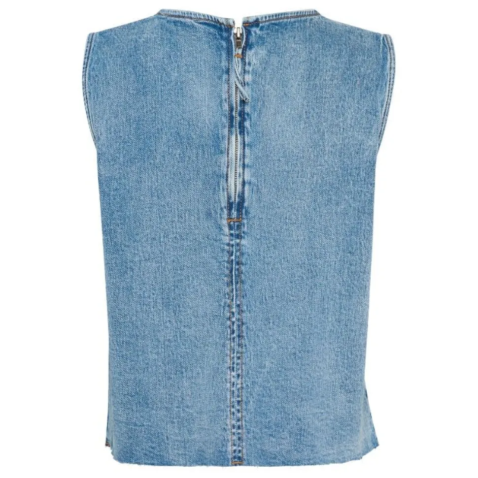 Denne ærmeløse top i Light Blue Retro Wash kombinerer et moderne boxy fit med en klassisk denimfinish. Den hoftekorte længde giver et afslappet, men veldefineret udtryk, som gør toppen nem at style både med højtaljede bukser, nederdele eller som lag-på-lag over en skjorte.