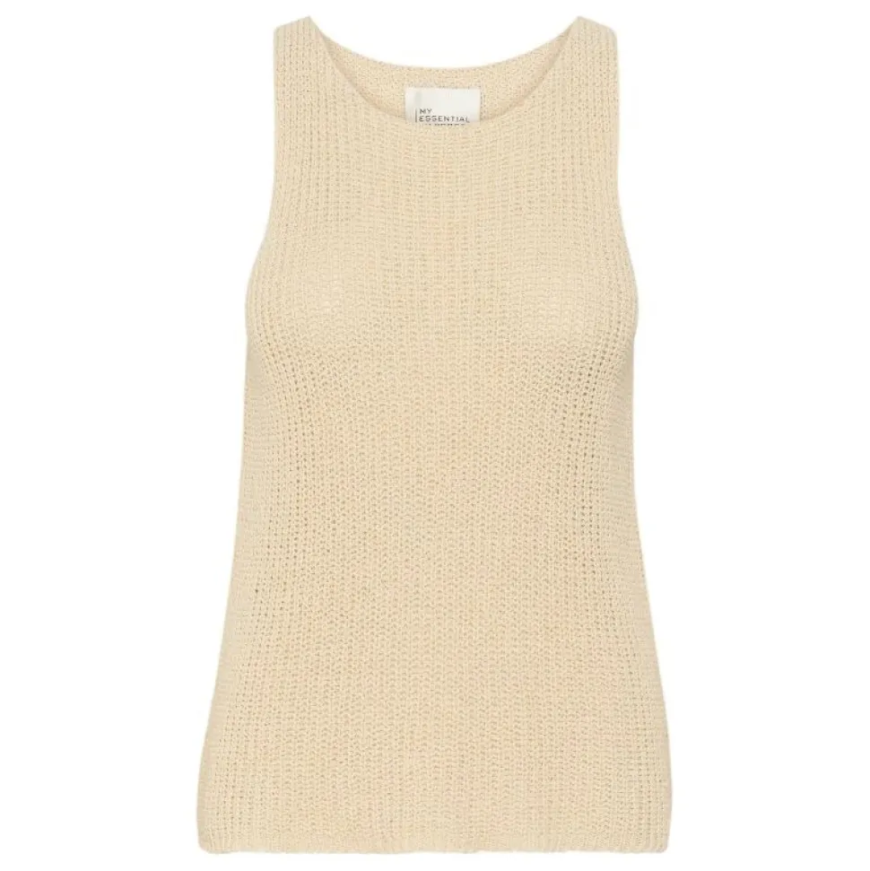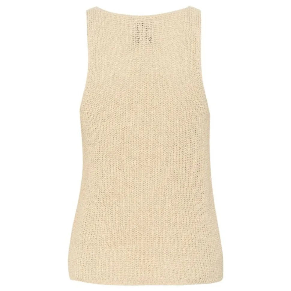 Denne strikkede ærmeløse top i farven Almond Milk kombinerer et afslappet udtryk med moderne detaljer. Med sin casual pasform, runde halsudskæring og brede ærmegab får du en luftig og let silhuet, der passer perfekt til forår og sommer – enten alene eller som del af et lag-på-lag outfit.