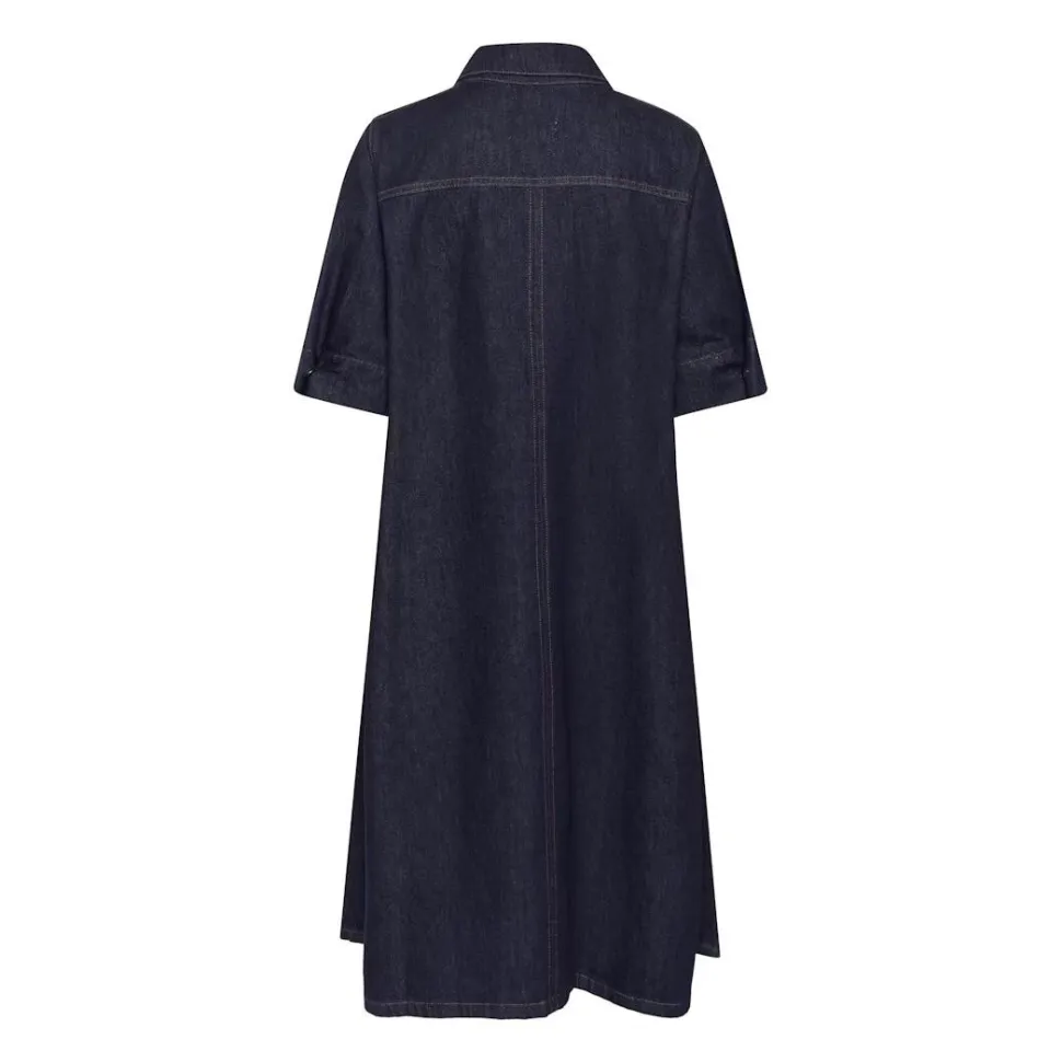 Klassisk denimkjole med tidløse detaljer. Kjolen er designet med en lige A-silhuet, halv-lange ærmer, midi-længde og en synlig lynlås foran, der tilfører et elegant og moderne udtryk. Den skarpe krave, markerede manchetter og den ensartede mørkeblå finish fuldender det sofistikerede look. Et alsidigt garderobeitem, der både fungerer som enkelt statement og i lag-på-lag styling.