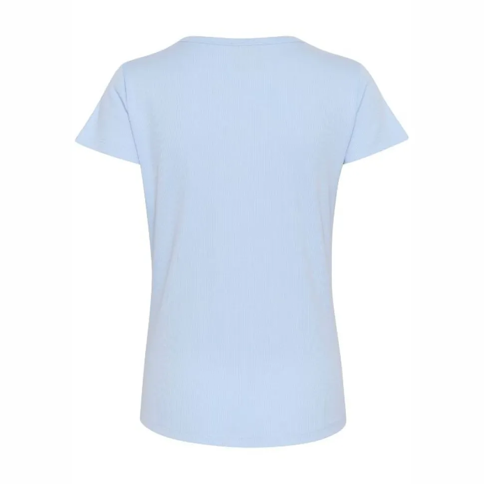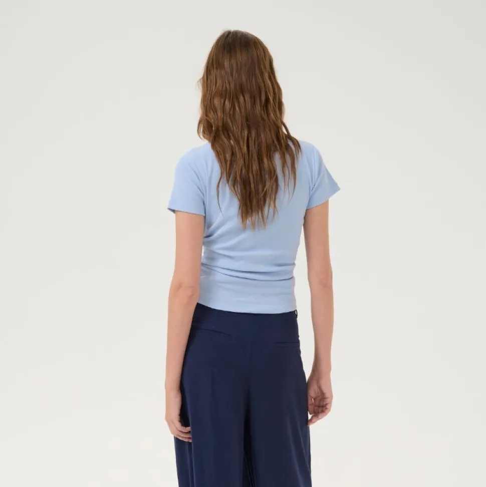 Denne T-shirt i farven Kentucky Blue har en afslappet pasform og en hoftekort længde, hvilket gør den til et alsidigt valg til både hverdagsbrug og afslappede lejligheder. De korte ærmer og den bløde bomuldsblanding med en smule elastan sikrer god bevægelighed og komfort hele dagen. Den rene og enkle stil gør T-shirten nem at kombinere med alt fra jeans til nederdele – et sikkert basis-item i enhver garderobe.