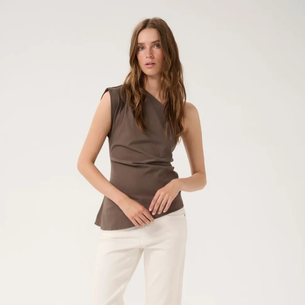 Denne ærmeløse top i farven Major Brown har en moderne, asymmetrisk halsudskæring og diskrete rynkedetaljer i siden, som skaber en flatterende og feminin silhuet. Toppen er designet i en blød og strækbar kvalitet med LENZING™ ECOVERO™ viskose, nylon og elastan, hvilket giver en tæt og behagelig pasform med masser af bevægelighed.