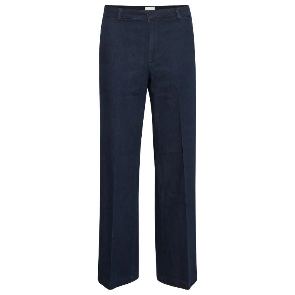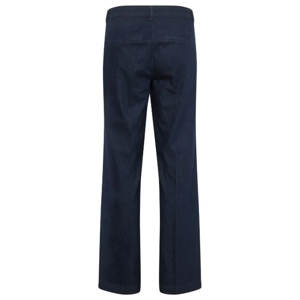 Disse jeans med vide ben kombinerer en afslappet pasform med et stilrent, struktureret udtryk. De har en mellemhøj talje og elegante paspolerede baglommer, der tilfører et skræddersyet præg. Den fulde benlængde giver et sofistikeret look, mens den løse pasform og det bløde bomuldsstretch sikrer komfort hele dagen. Perfekte til både hverdag og mere polerede outfits. Farven er en klassisk mørkeblå vask, som er nem at style med alt i garderoben.