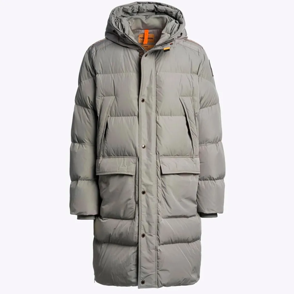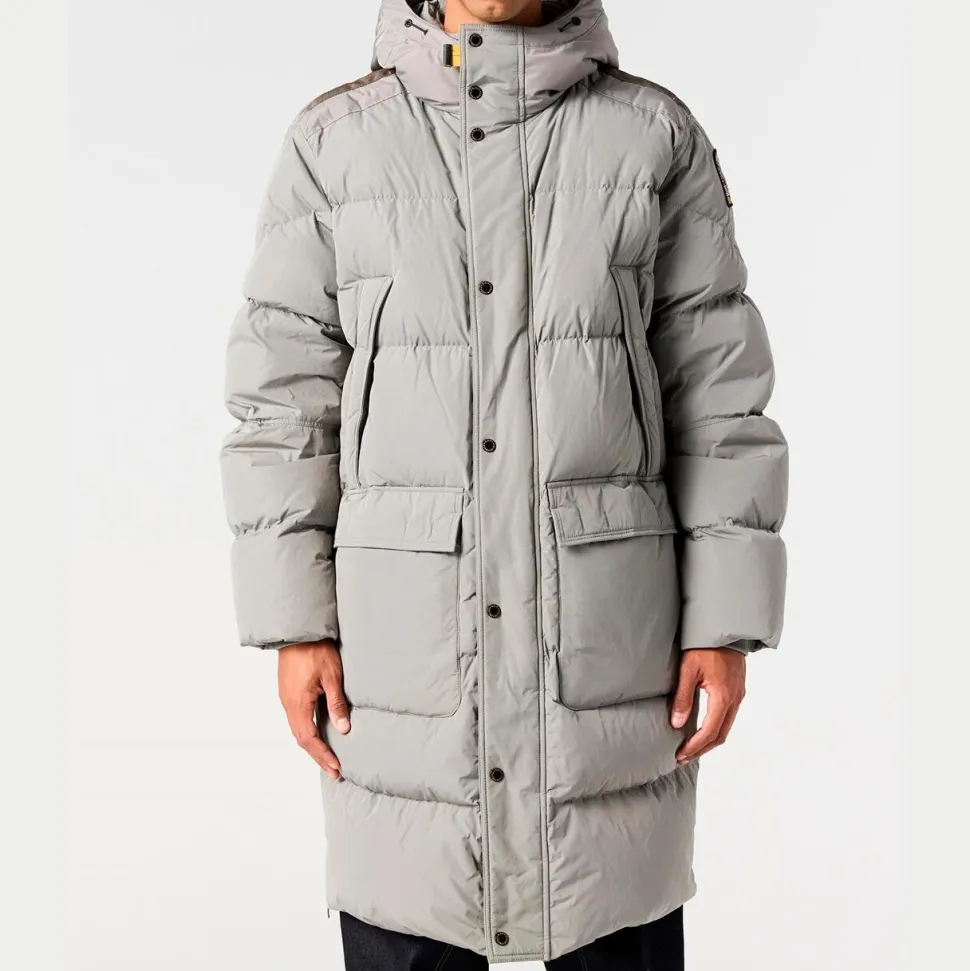 Frontlukningen består af en tovejslynlås dækket af en knaplukning, og hætten kan justeres med snøre for ekstra komfort og beskyttelse mod vind og vejr. Jakken er udstyret med fire udvendige lommer med trykknapper og tre indvendige lommer samt sidesliders med lynlås, hvilket kombinerer praktisk funktionalitet med et raffineret udtryk. Elastiske ribkanter sikrer en tæt og fleksibel pasform, mens det ikoniske Parajumpers-logo på ærmet og den gule båndlukning ved halsen fuldender designets karakteristiske finish.