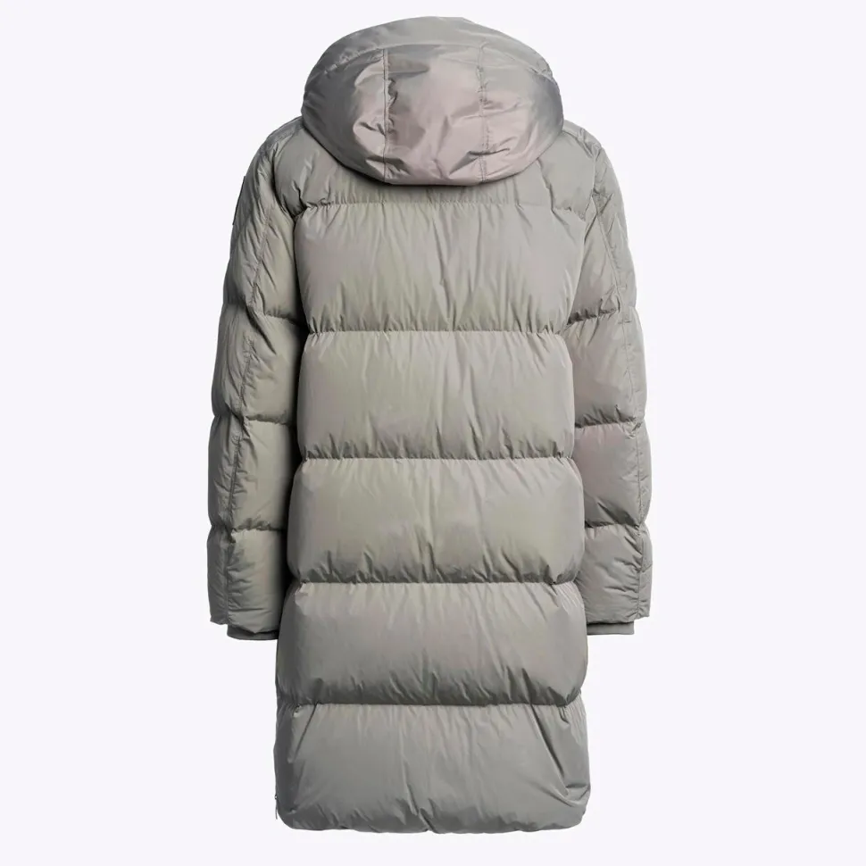 er fremstillet i mikroreps polyester med høj densitet med vandafvisende behandling og memory-effekt, kombineret med lamineret, genbrugt nylon oxford for ekstra holdbarhed og beskyttelse. Indvendigt er jakken foret med genbrugt nylontaft med mat finish, og fyldet består af 90% andedun og 10% andefjer, som sikrer optimal varme og lethed. Hele 65% af materialerne er genbrugte, hvilket understreger Parajumpers’ fokus på ansvarligt design.