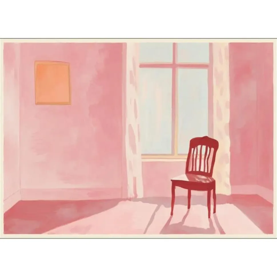 Træd ind i roen. Et poetisk kunsttryk, der fanger et stille, solbeskinnet rum med en enkel rød stol omgivet af bløde, rosa nuancer. Værket udstråler varme, fred og eftertænksomhed, og skaber en harmonisk stemning i ethvert rum. Plakaten er ideel til minimalistiske indretninger eller rum, hvor et stille øjeblik af ro og refleksion ønskes. Kunstværket tilføjer elegance og emotionel dybde til væggen, samtidig med at det inviterer beskueren til at drømme og reflektere.