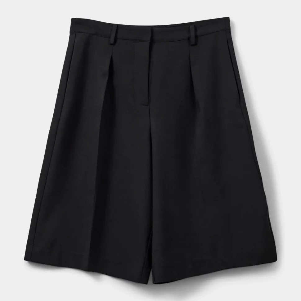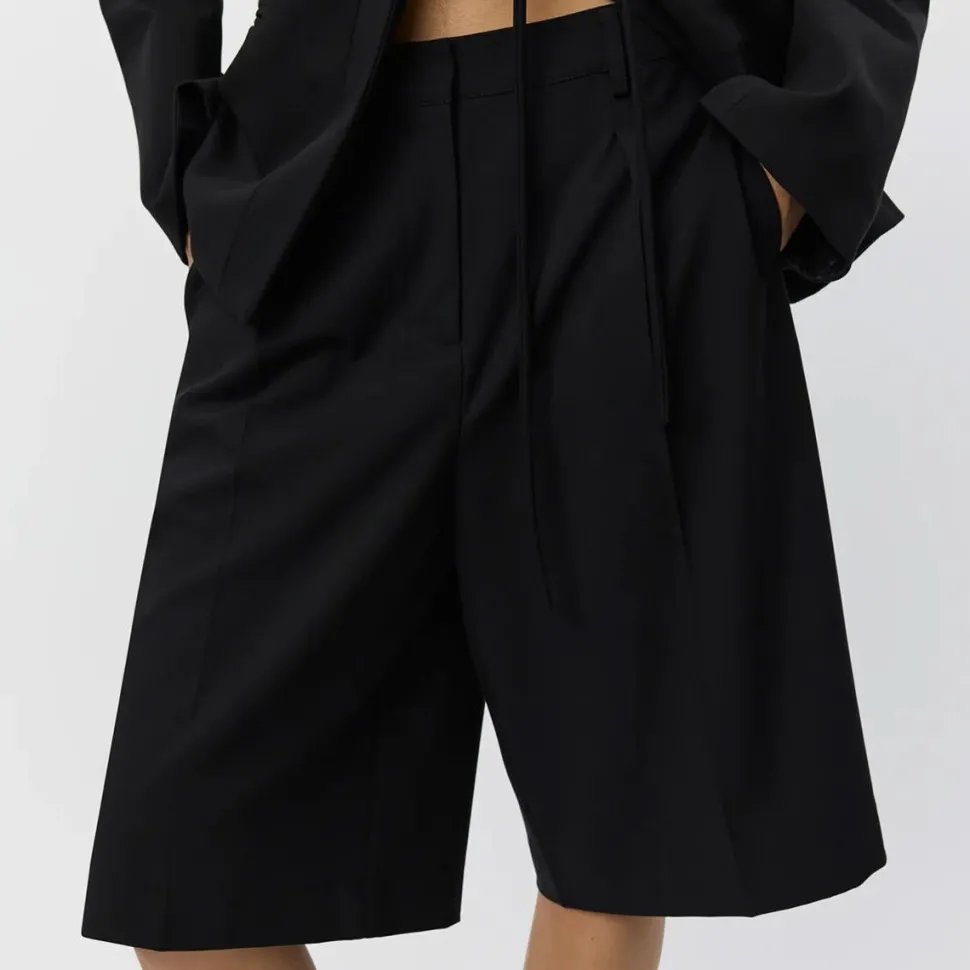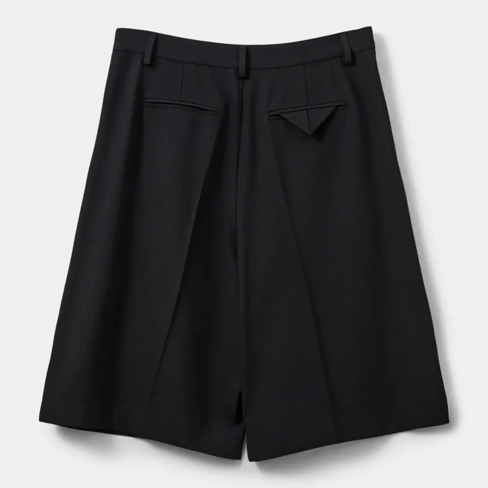 Fine shorts, hvori tidløs enkelhed møder sofistikerede detaljer. De klassiske presfolder og fine læg giver en elegant og struktureret silhuet, mens lommer i sidesøm og paspolerede baglommer med klap tilfører funktionalitet og et poleret finish. Hægtelukning og lynlås sikrer en ren afslutning, og de diskrete lommedetaljer understreger shortsens elegante design.