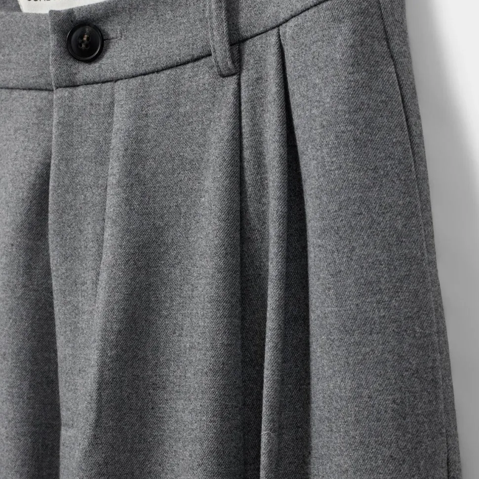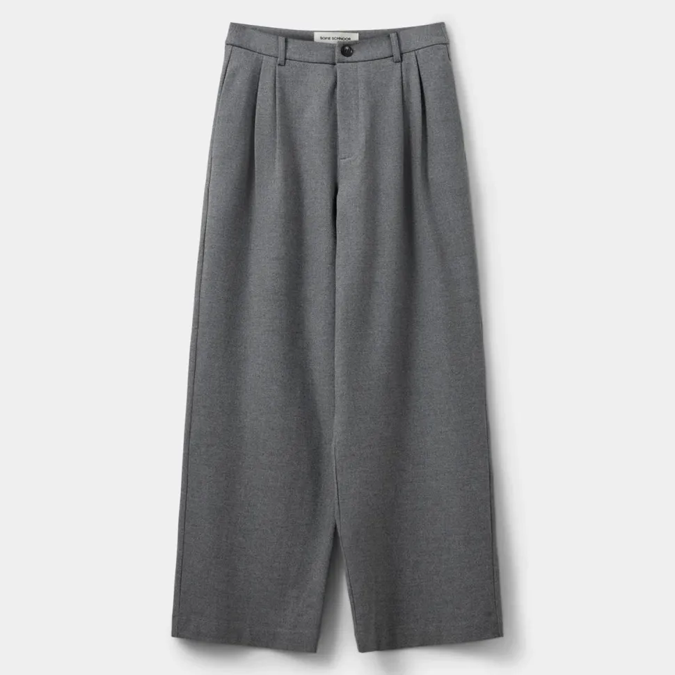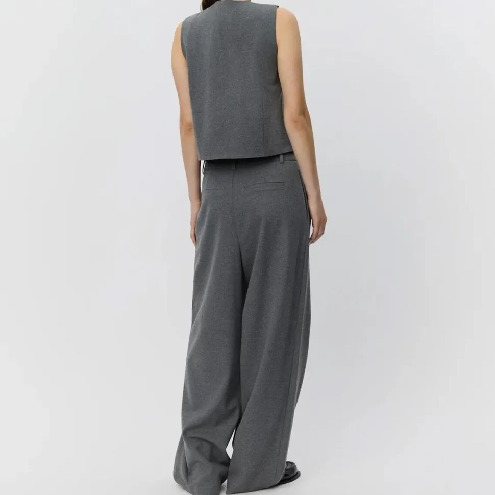 Elegante og alsidige bukser i et moderne design. Bukserne er designet med høj talje og vide ben, hvilket både giver komfort og fremhæver silhuetten på smukkeste vis. De fine læg foran tilfører struktur, mens lynlås- og knaplukning, bæltestropper og sidelommer sikrer praktisk funktion uden at gå på kompromis med designet. Bagpå findes paspolerede snydelommer, som giver et poleret og detaljeret finish.