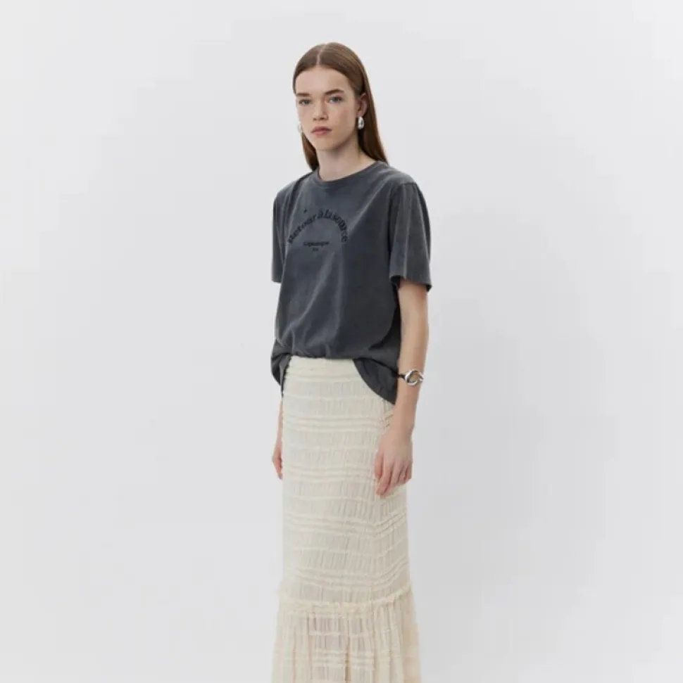 T-shirt i forvasket sort med et afslappet, cool udtryk. Designet har rund hals, korte ærmer og et sort tekstprint på brystet med ordene “Retour à la source, Copenhague 2001”. Fremstillet i blød bomuld med en behagelig relaxed pasform – perfekt til både jeans og nederdele.
