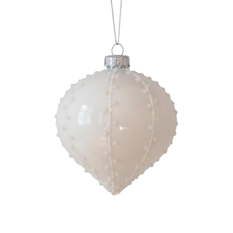 Yndefuld julekugle med diskrete perler. Julekuglen udstråler elegance og tilfører en lys, harmonisk stemning til juletræet. Julekuglen emmer af glimtende detaljer, varme stemninger og et design skabt til årets smukkeste øjeblikke. Benyt ornamentet på juletræet, som ophæng i vinduet eller som dekorative elementer i skåle og juledekorationer. Små magiske detaljer, der gør december helt særlig.