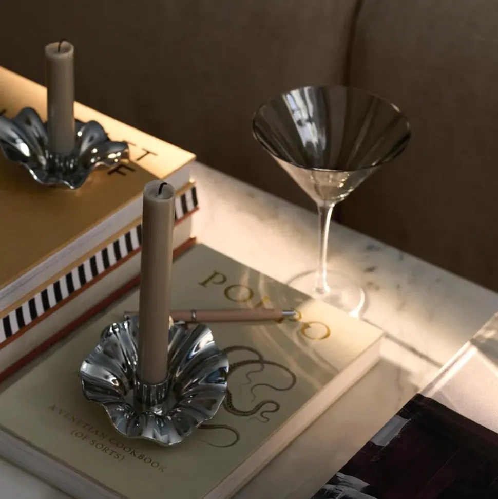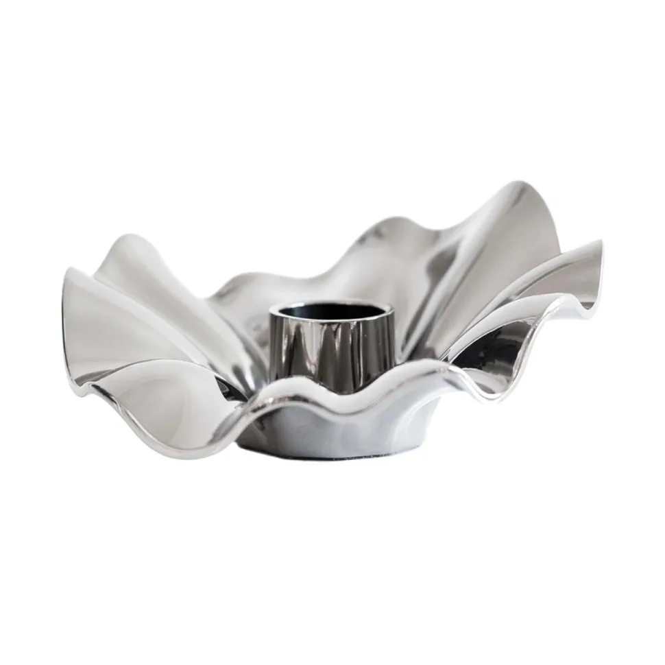 Enkel og stilfuld lysestage, der er skabt til de hyggelige øjeblikke. Kombinationen af metallets fine finish og en smuk, organisk form, skaber en elegant kontrast. Qua lysestagens bløde og naturlige formsprog tilføres en diskret elegance til enhver boligindretning, idet metallet fremhæves på moderne og stilfuld vis. Lysestagen er ej blot en funktionel genstand – dén er et dekorationselement, der bringer varme og harmoni ind i hjemmet.